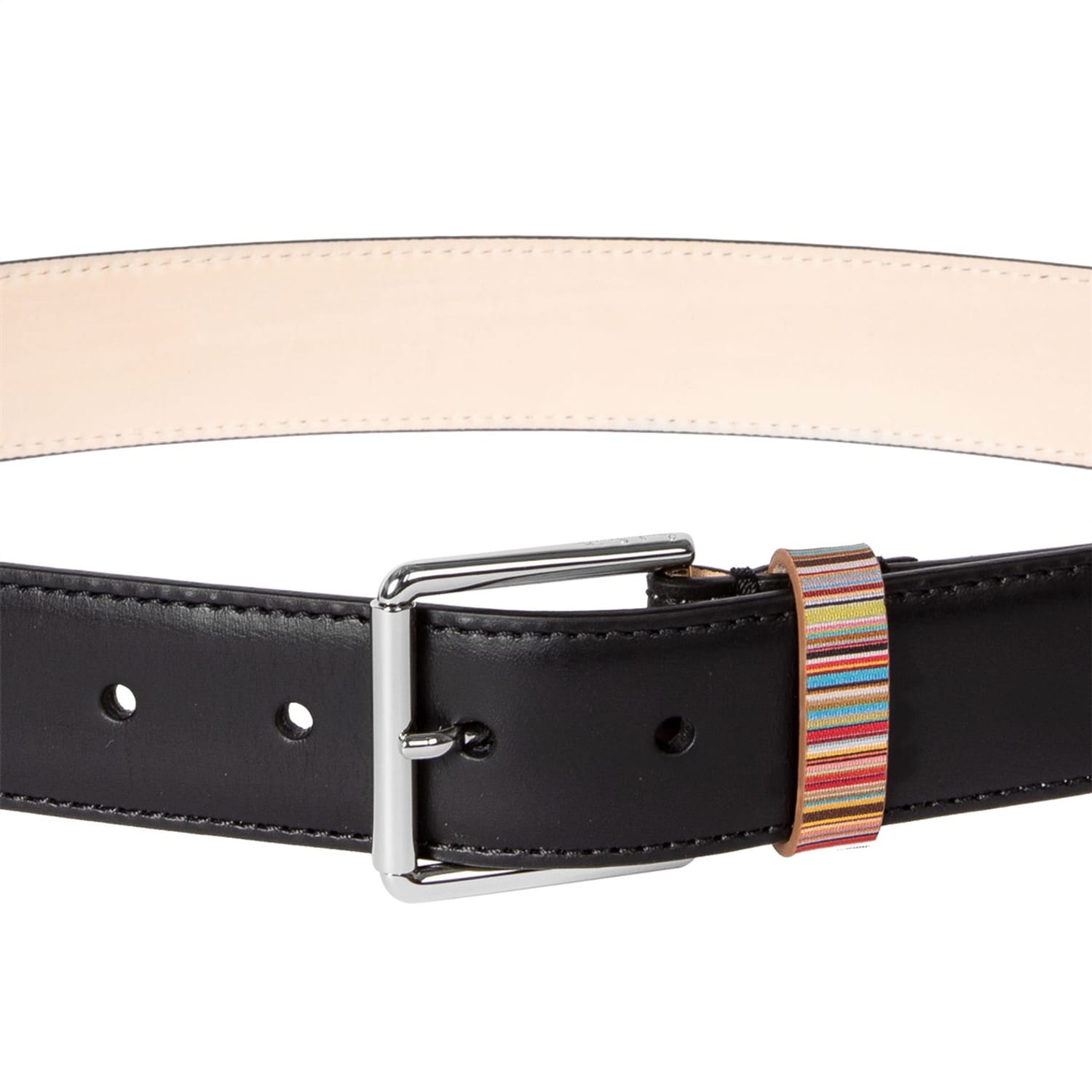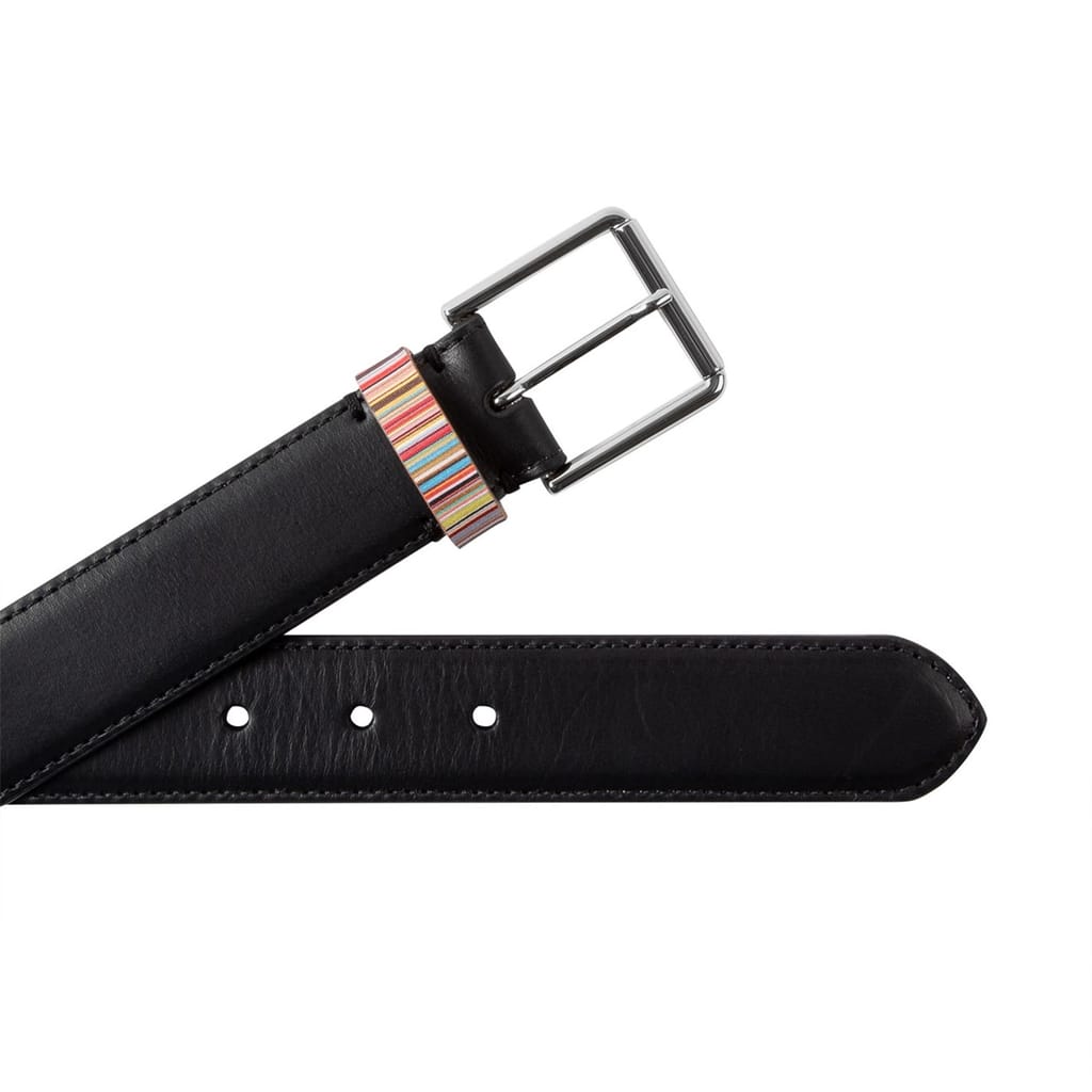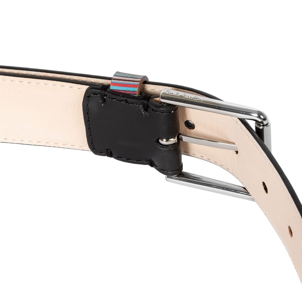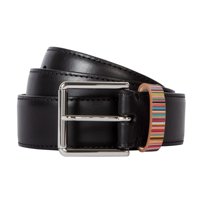 Add a preppy yet playful finish to your attire with Paul Smith's Keeper Belt. Expertly crafted in Spain, this 3.5cm wide smooth leather belt is presented in a solid colouring with the British brand's iconic 'Signature Stripe' pattern adorning the keeper loop for a sophisticated style with a whimsical touch. Finished with a silver-toned metal buckle, this belt can compliment both casual and smart outfits. Material Composition: 100% Leather with 100% Zamac buckle.
