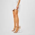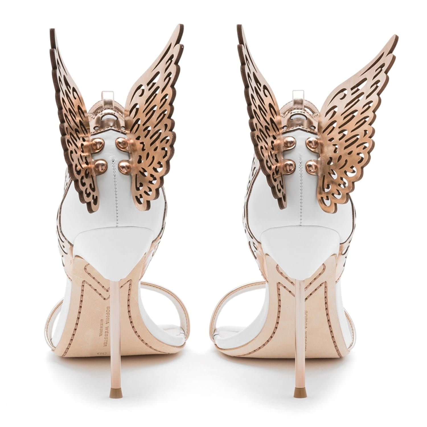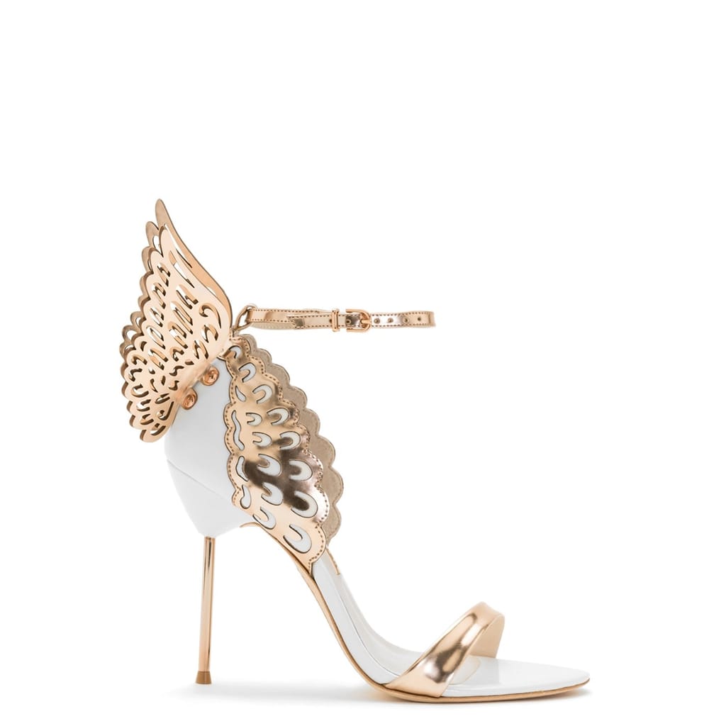 Upgrade your evening wear ensemble with these Evangeline wing heels from Sophia Webster. This style features the iconic butterfly motif with ribbed accents in metallic and boasts a delicate ankle strap with an open toe. Finished with a feminine thin stiletto heel, this style would make a perfect finish to your evening attire.