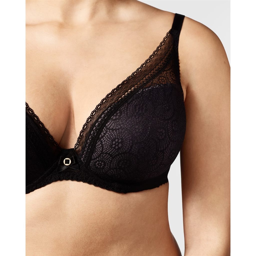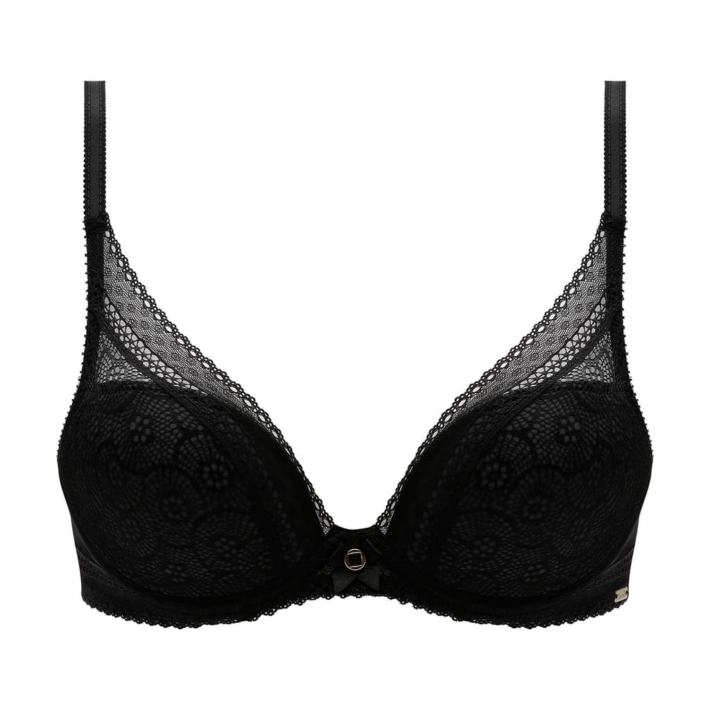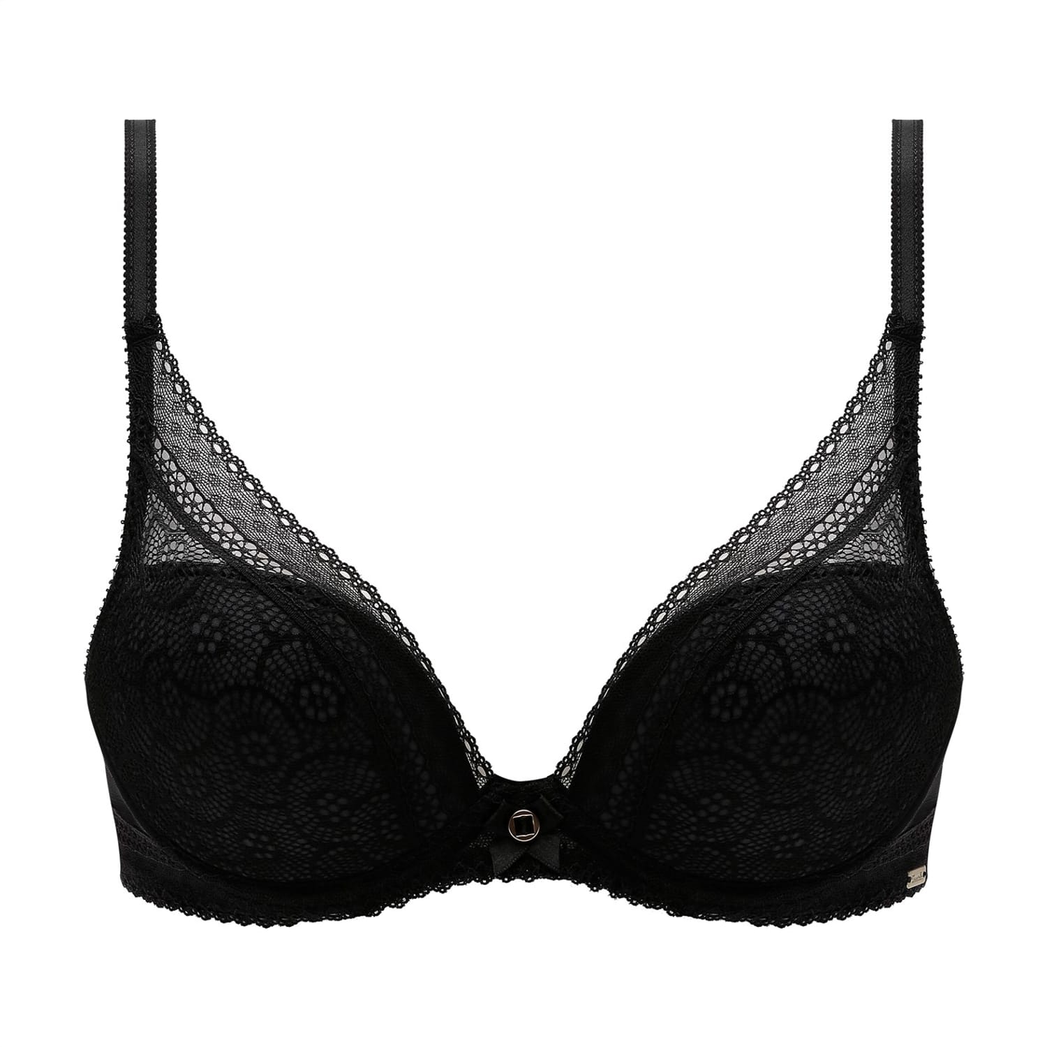 A modern T-shirt bra with a decorative graphic lace and sexy plunging effect for enhanced modernity. Removable padding in small sizes enhancing the cleavage effect. Mounted on a base for better lift and support. Fully adjustable straps and brassiere back. Designed in France. PLEASE NOTE THAT FOR CHANTELLE, E CUP IS EQUAL TO A DD IN UK SIZES AND F CUP IS EQUAL TO UK E, G IS EQUAL TO UK F.- Wired