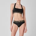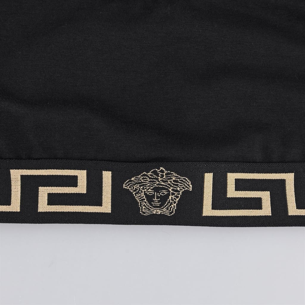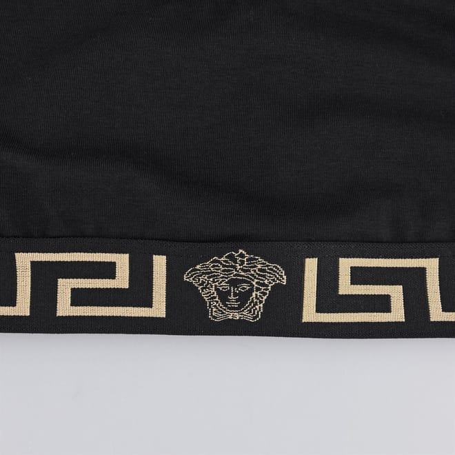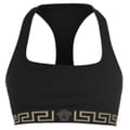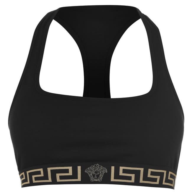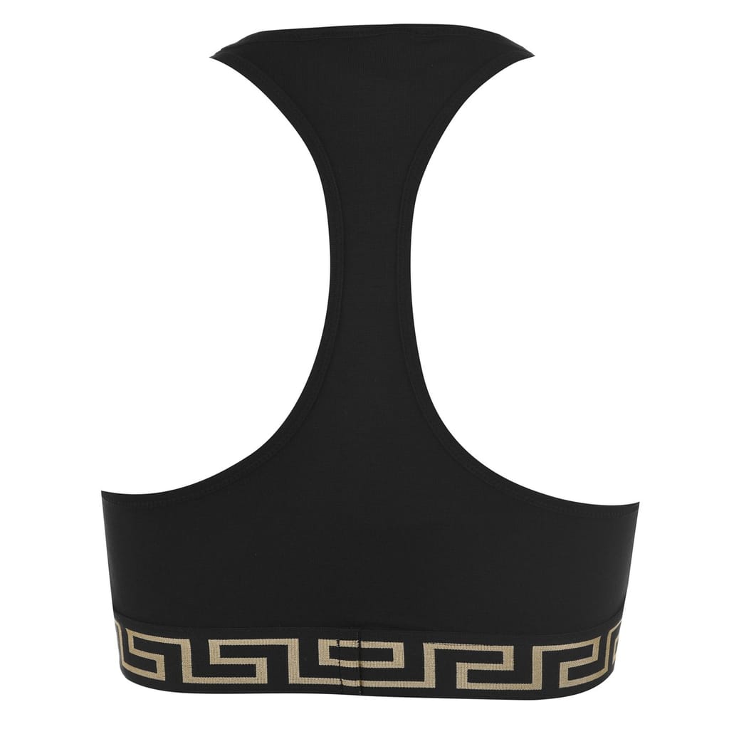 Make a designer addition to your essentials with the Greca Border Sports Bra from Versace. Crafted from a cotton blend, this bra is cut with a square neckline leading to a racer back to create a sporty silhouette. Designed with the Greca print woven along the elasticated under-bust-band, this bra is finished with the iconic Medusa motif woven to the centre - wear yours with the matching thong or briefs. -