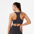 -- Cut in a cropped silhouette providing a medium level of support, the racer-back silhouette cut with a scoop neckline allows for a wide range of motion.