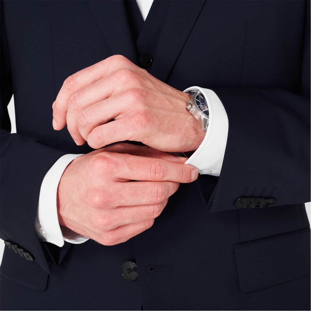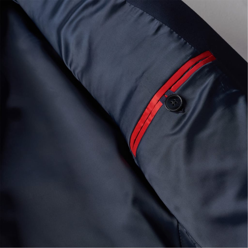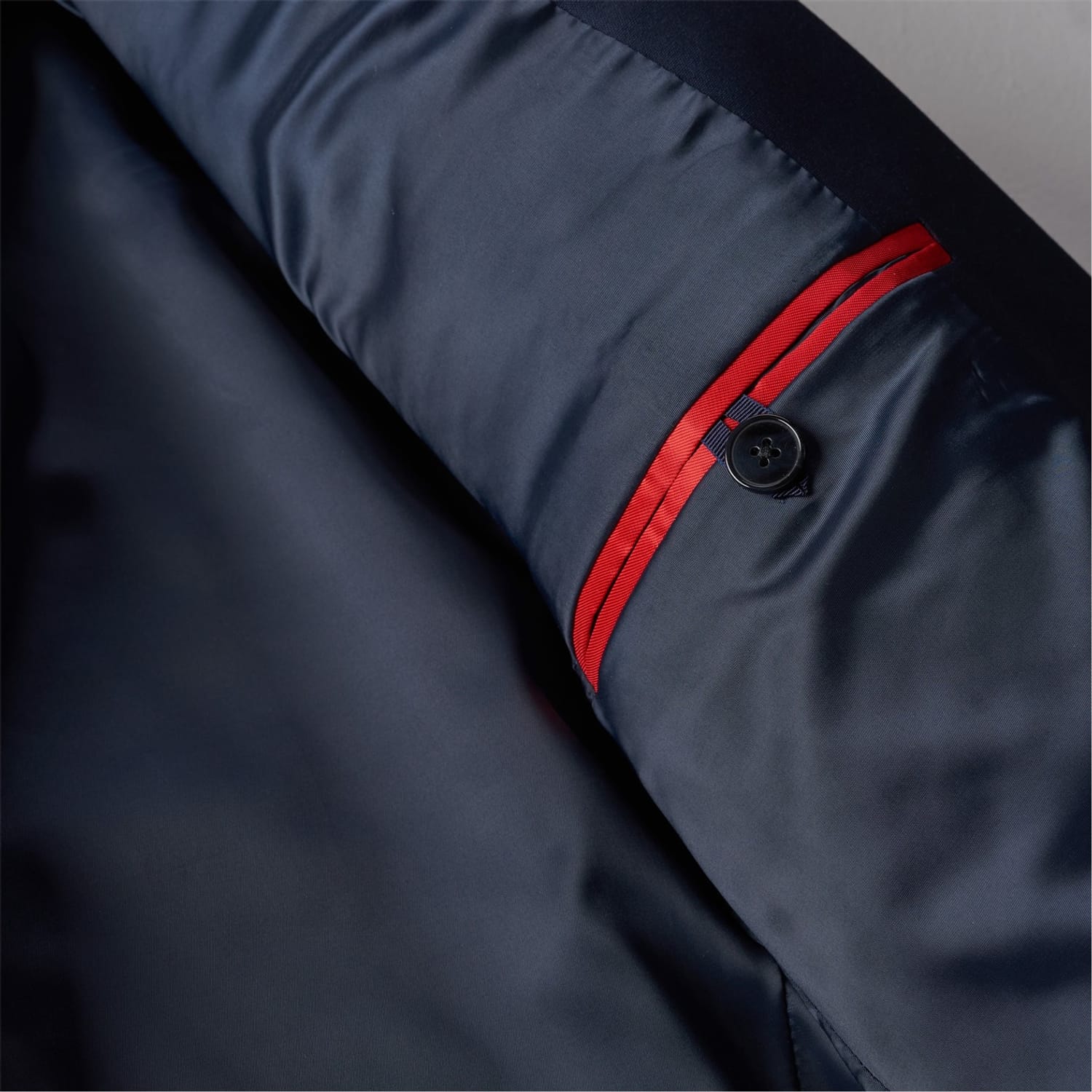 - Notched lapels and flap pockets maintain classic suiting elements while delivering a contemporary aesthetic.