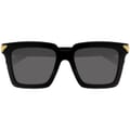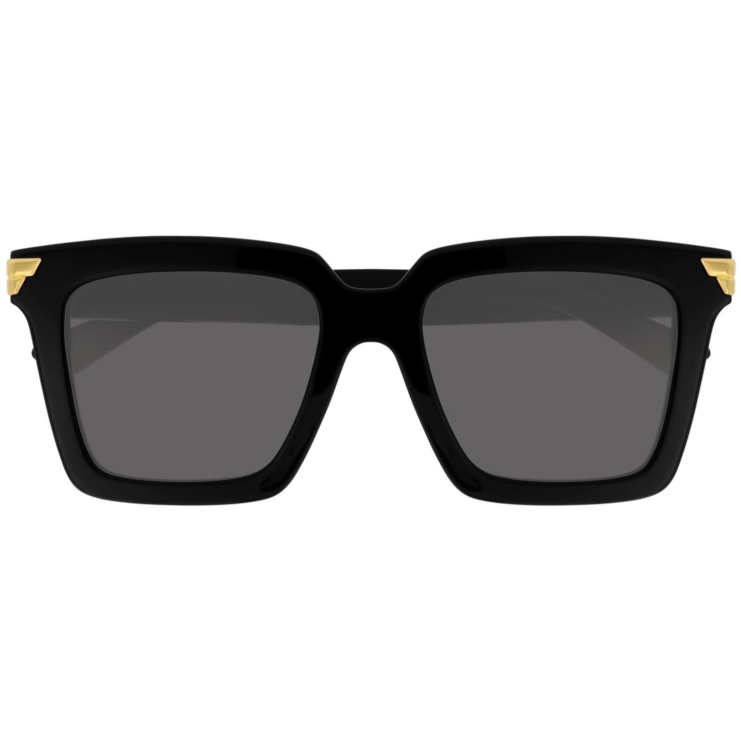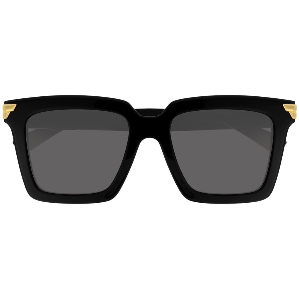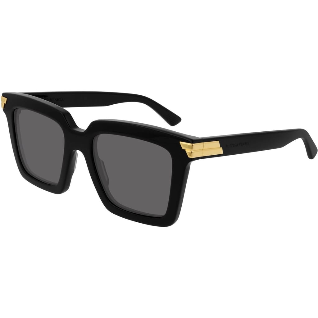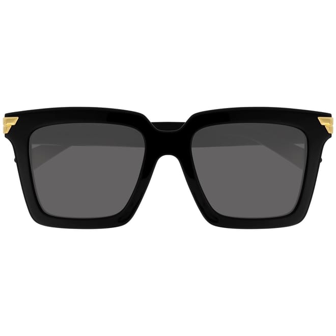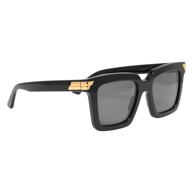 Revive your outwear ensemble with the Square Frame Sunglasses from Bottega Veneta. This pair of sunglasses feature grey, square lenses with a solid black frame, gold-tone detailing along the edges and Bottega Veneta logo branding along the arm to complete the look. -