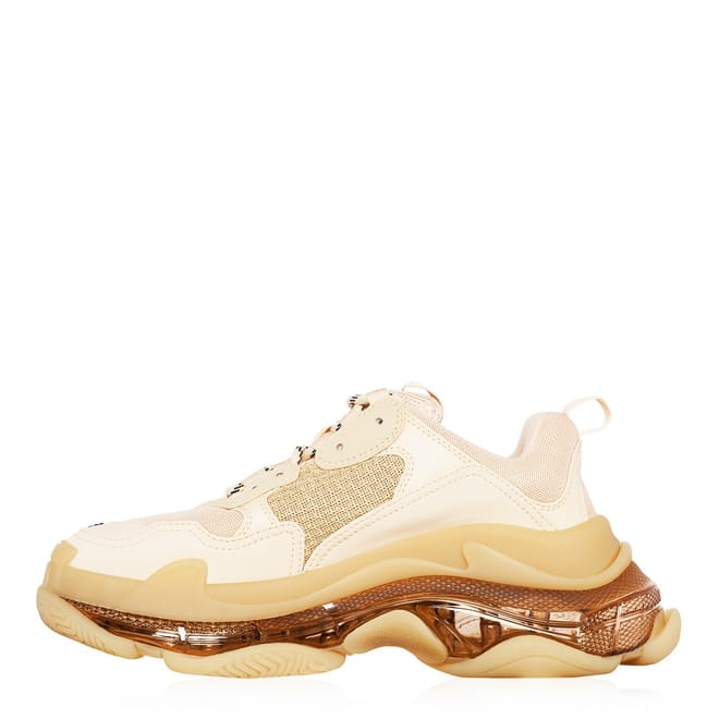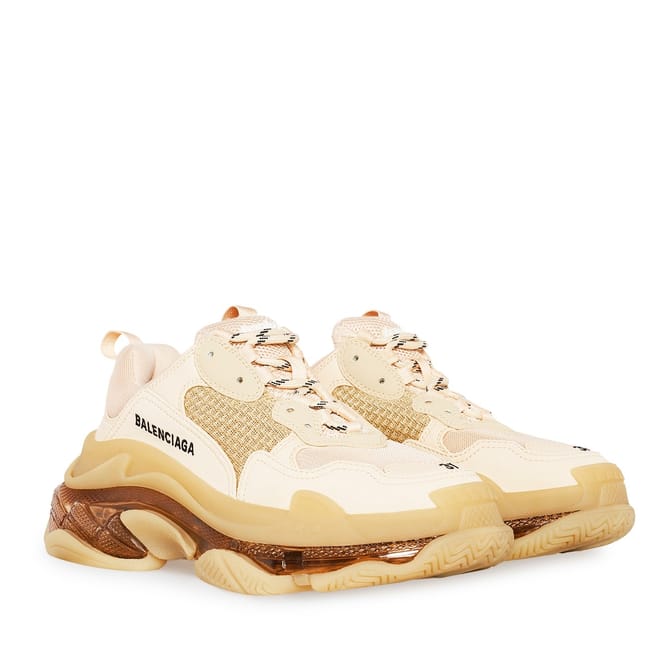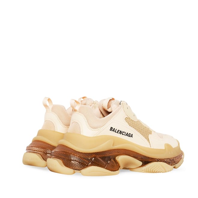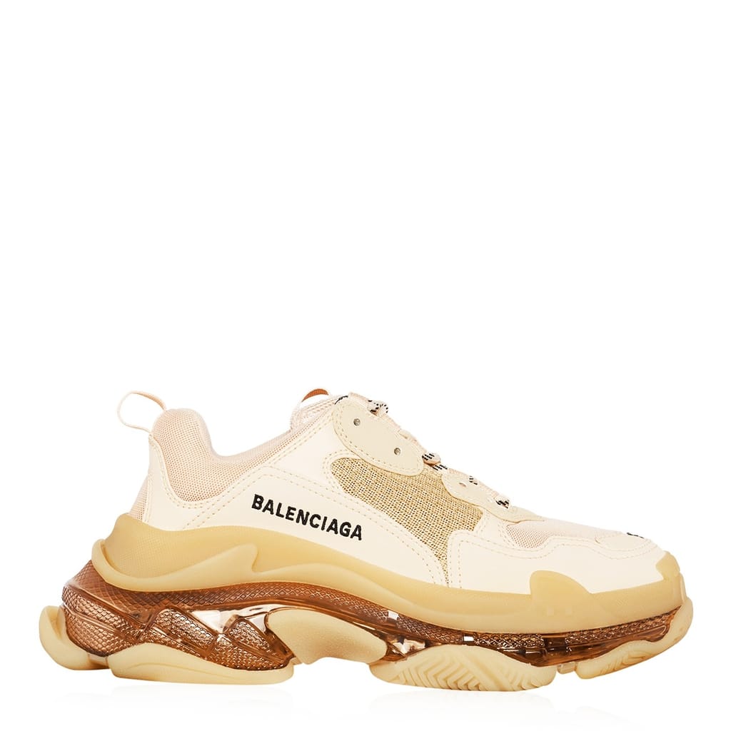 Re-invent your casual attire with these Triple S Clear Sole Trainers from Balenciaga. This on-trend oversized style is crafted with vegan leather, double foam and mesh, while featuring hiking boot inspired rope rounded laces and a chunky triple sole for superior cushioning with elevation. Designed with a pull-on tab to the back and to the tongue, the piece also features the classic Balenciaga touch, the size embroidered to the toe. The look is finished with the brand's signature logo embroidered to the side, embossed into the back of the sole and the classic Triple S branding to the tongue for instant brand recognition. Upper: leather and textile. Lining: textile. Sole: synthetic.