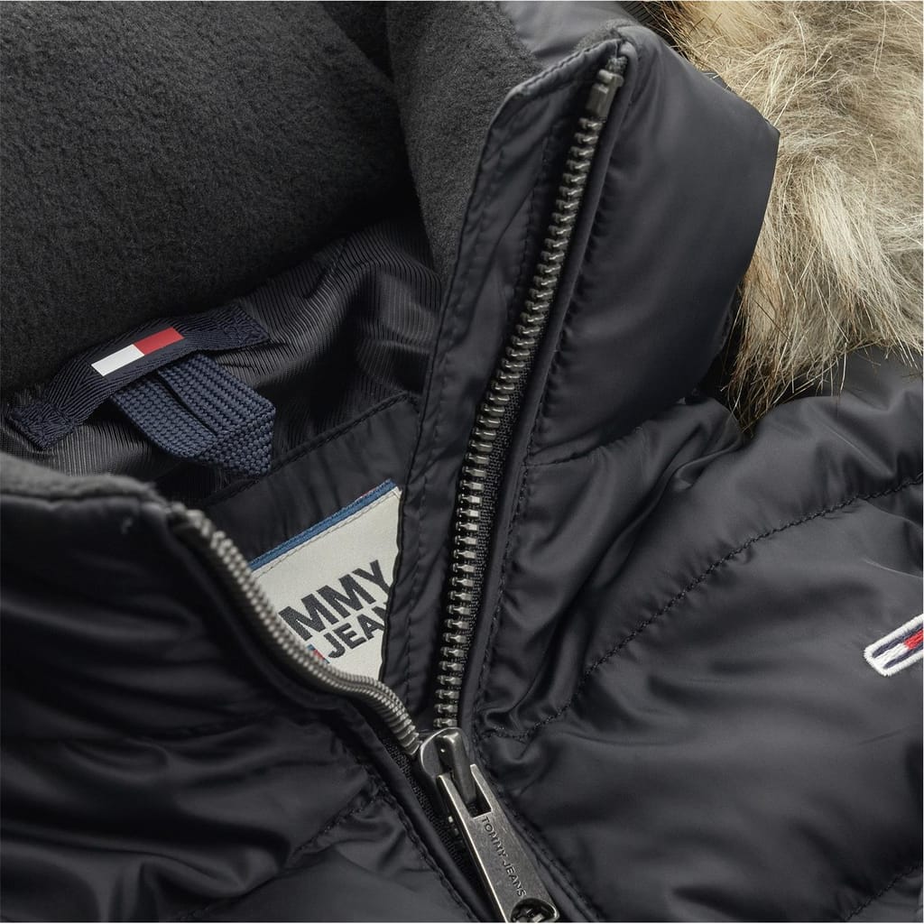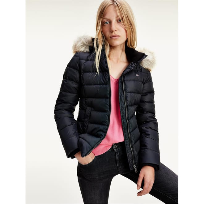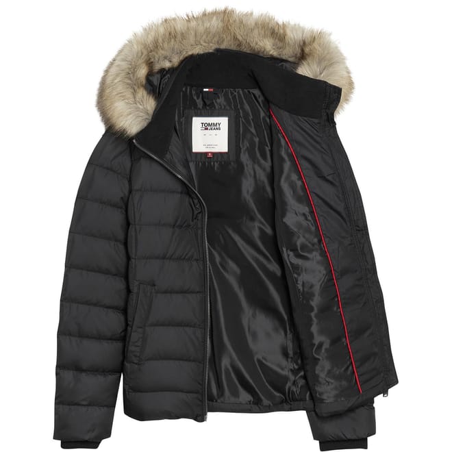 Add to your outerwear collection with the Tommy Jeans Essential Puffer Jacket. Crafted with long sleeves and a full zip closure, this piece features an all over quilted design. Complete with two side pockets and ribbed trims for a comfortable fit, this puffer jacket is finished with Tommy Jeans branding and a fur trim hood. Invest in this piece for the colder months.