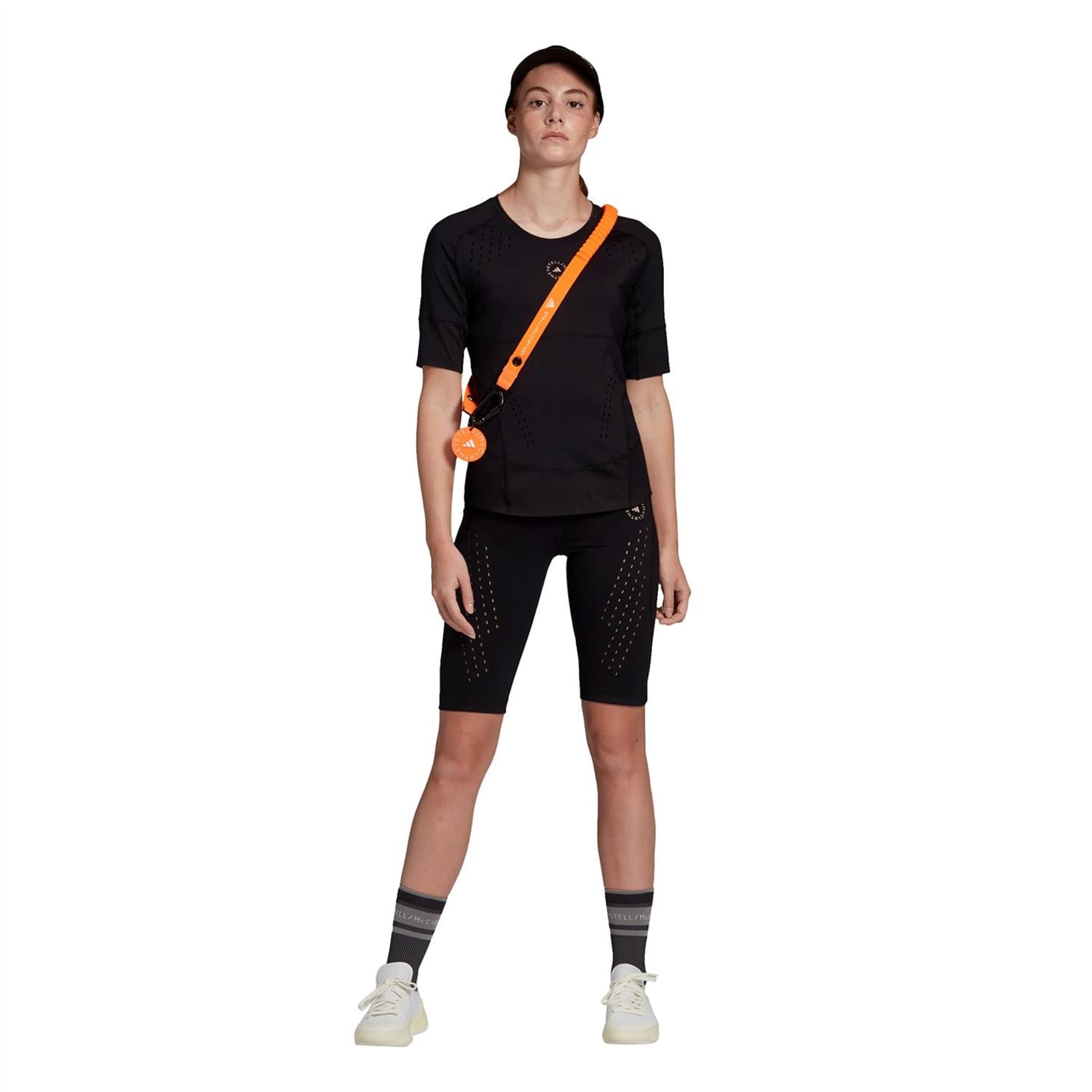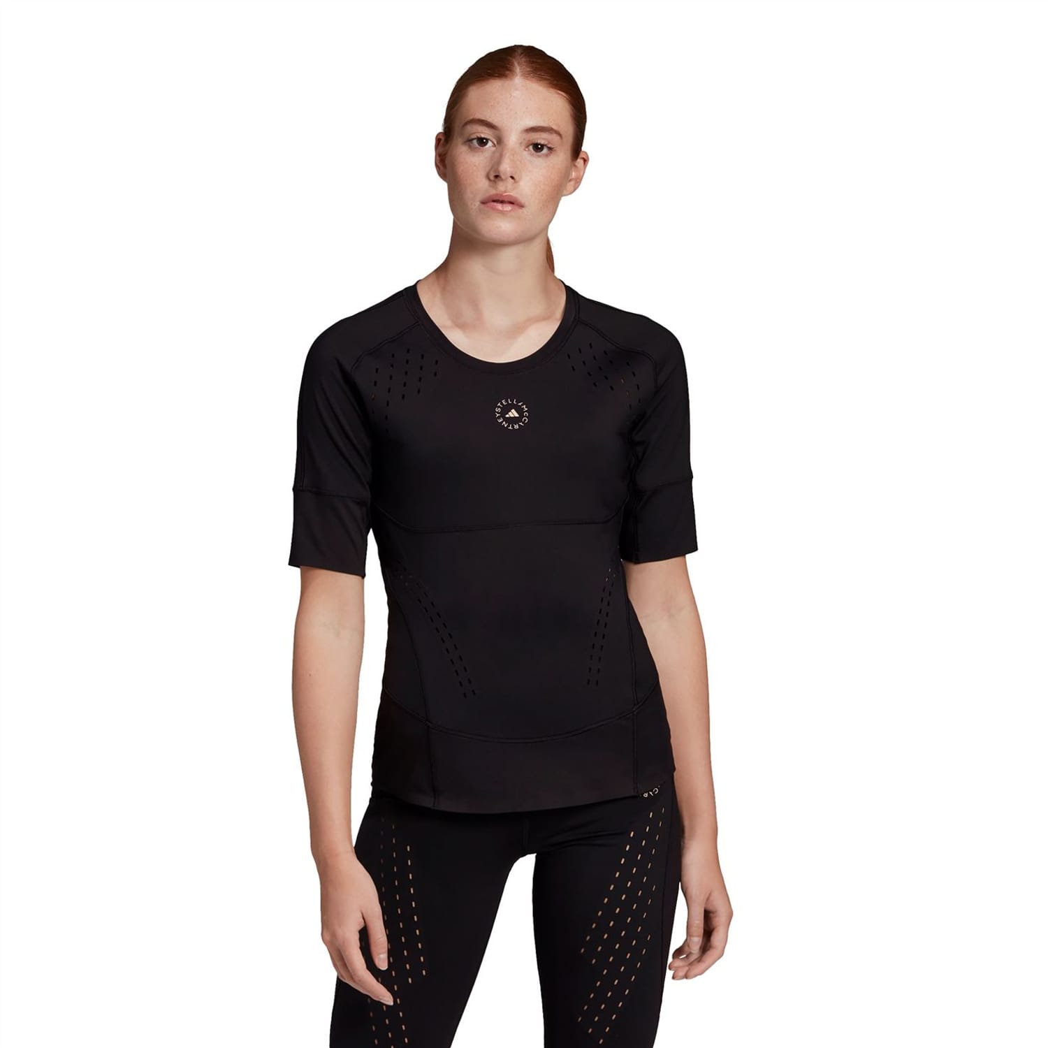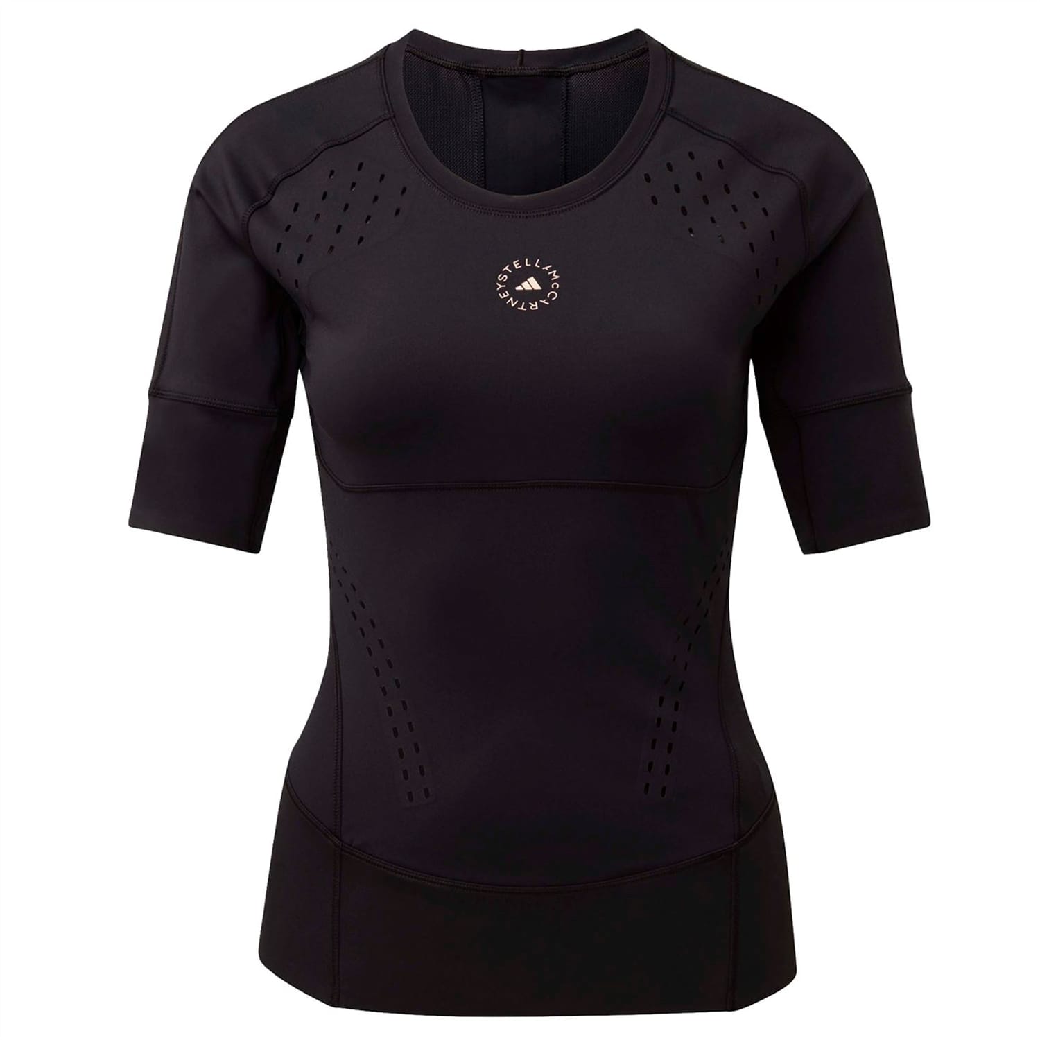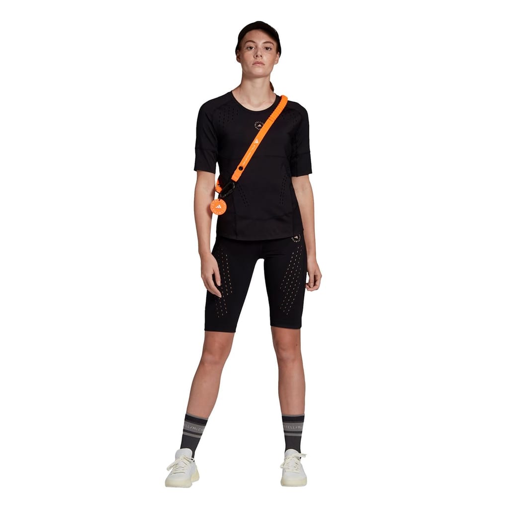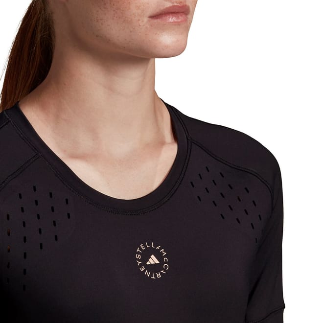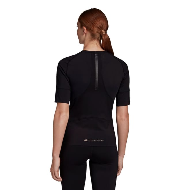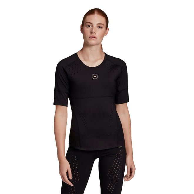 Elevate your training sessions with the Adidas by Stella McCartney t-shirt. This solid, waist-length top features a crew neck and short, plain sleeves for a comfortable fit. Designed for performance, it boasts a subtle logo pattern making it a perfect addition to your casual collection. -