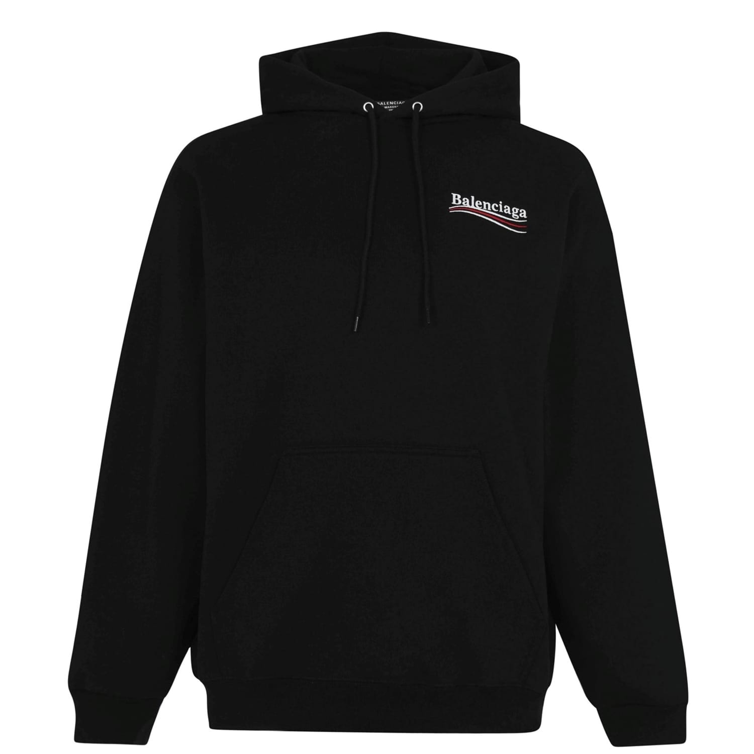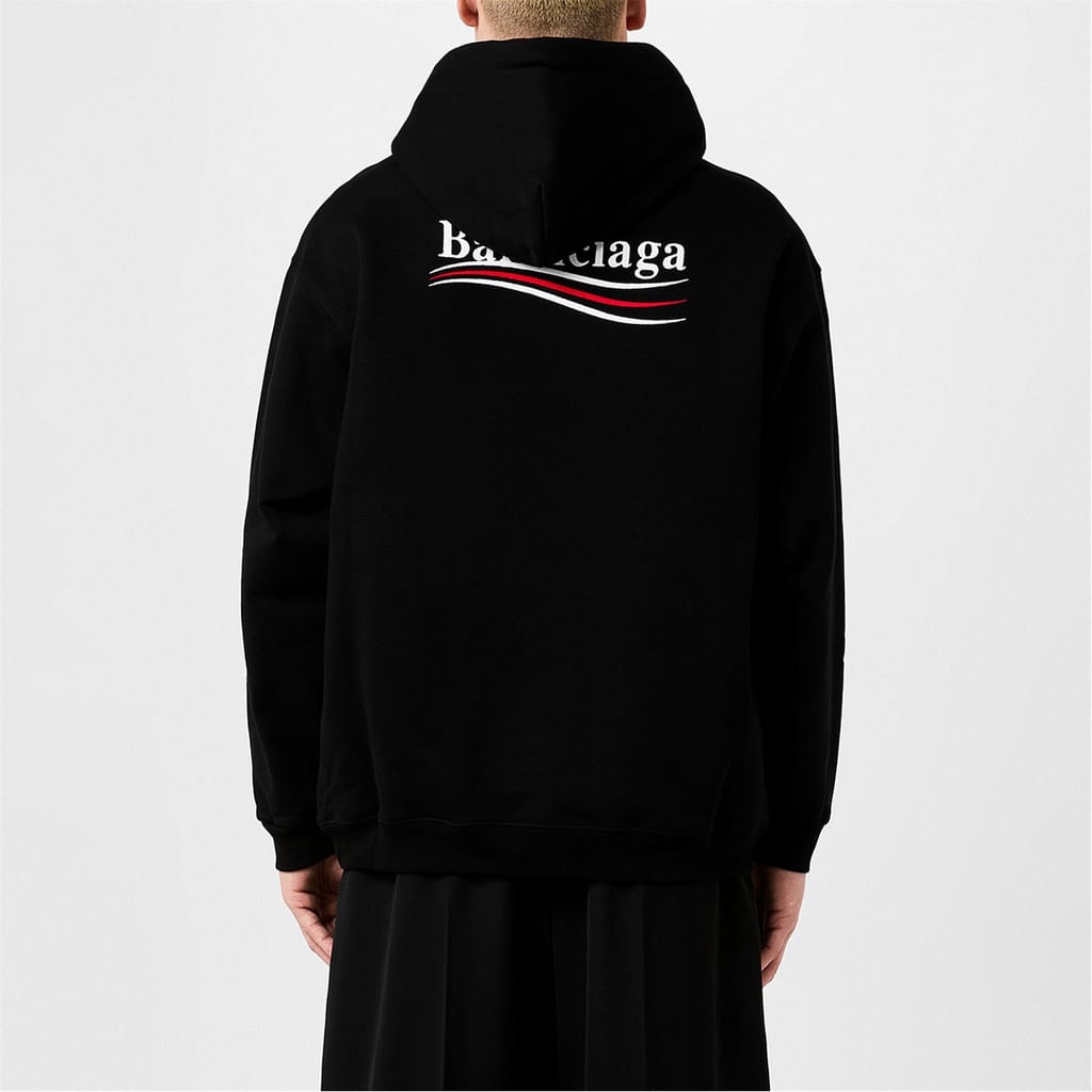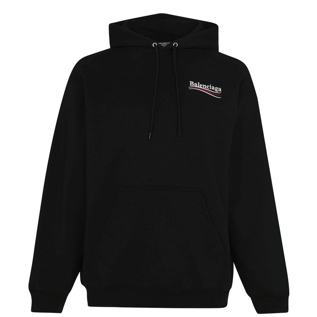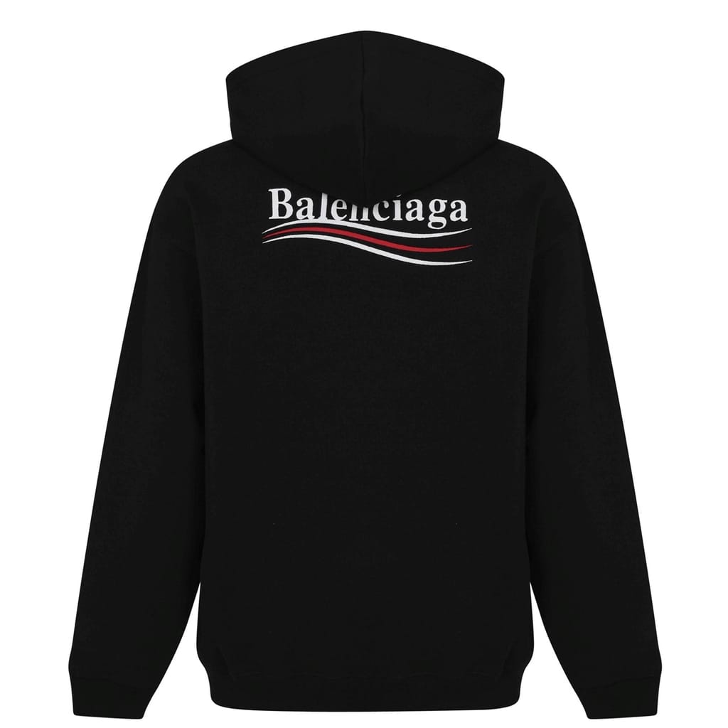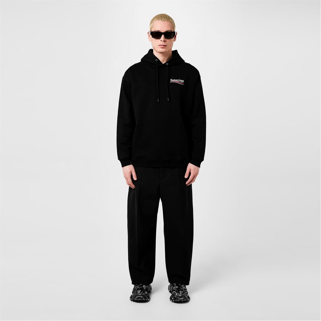 - Featuring a drawstring hood, you can adapt the coverage according to the weather, while the ribbed cuffs provide respite from cool breezes. Embodying the hallmark oversized silhouettes that define Balenciaga's collections, this cotton jumper is designed with dropped shoulders. With a front kangaroo pocket at the front, you can keep your everyday essentials close to hand at all times. Complete with the distinctive political logo adorning the chest and back, the label's luxury prestige will be instantly recognisable, whether you are meeting friends, exploring city streets, or simply -