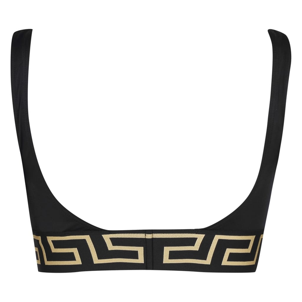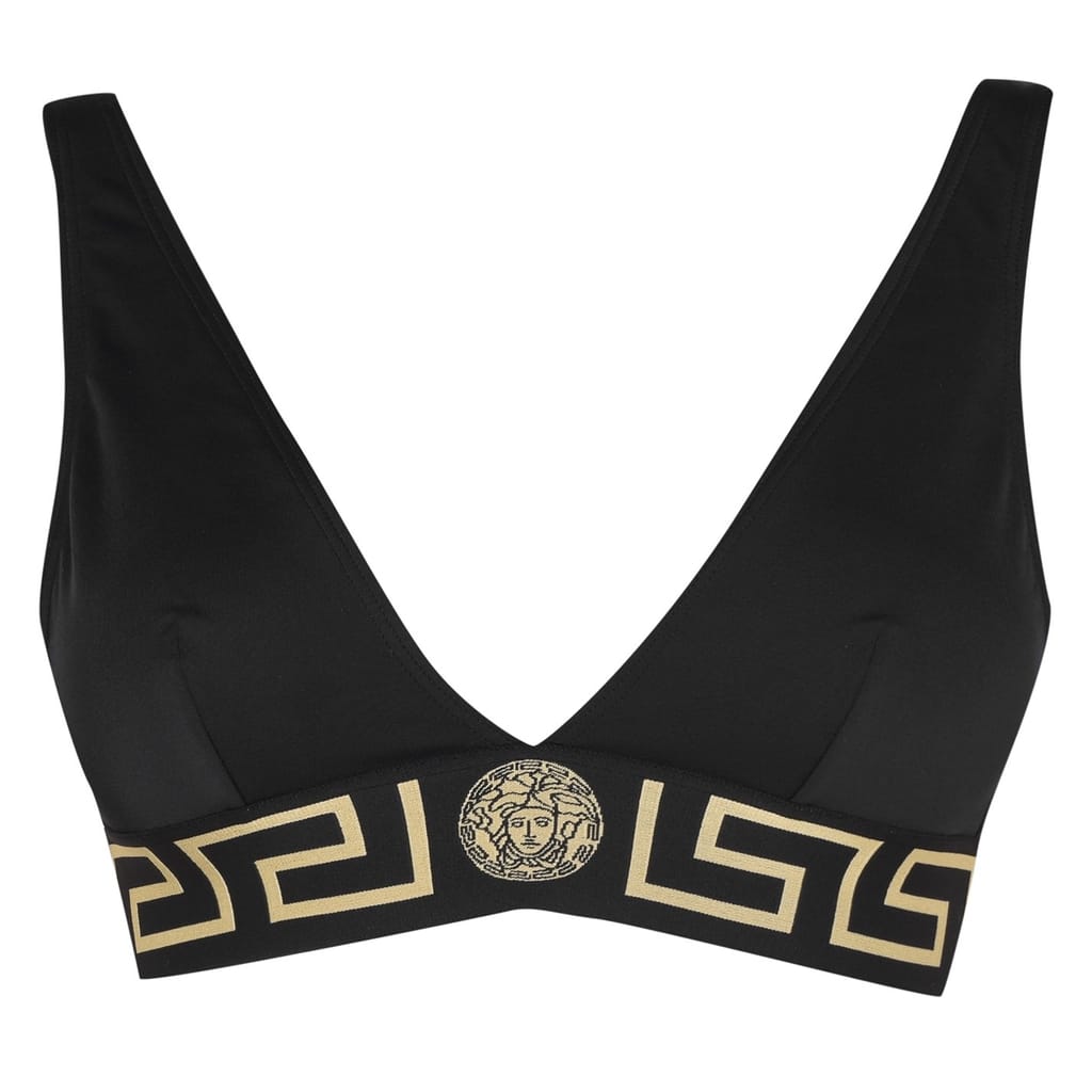 Refine your summer ensemble with this Triangle Bikini Top from Versace. Cut in a triangle design with a low v-neckline, this bikini top then comes further featuring a stretch nylon construction for a streamlined, form fitting design all while also including two standard shoulder straps and an elasticated under-band that's been adorned with the Greca and Medusa face brand emblems for an authentic Versace composition. You cannot miss this out on your beach and pool collections.