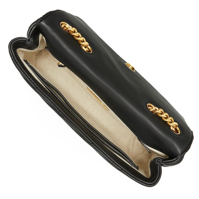 Update your accessories with the Kira Chevron Small Shoulder Bag from Tory Burch Crafted from chevron quilted lambskin leather with the brands signature double T gold hardware, this bag feature a magnetic snap closure and can be worn across the shoulder or crossbody.