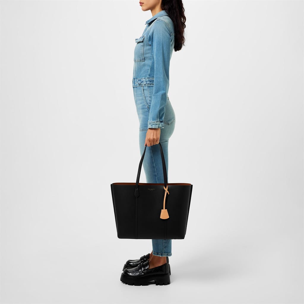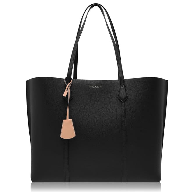 Update your accessories with the Perry Large Tote from Tory Burch. With a spacious main compartment that can hold a 13" laptop the Perry tote also offers 4 interior compartments for added storage. Crafted from Italian pebbled leather this bag is finished with a removable charm featuring the brands signature double T hardware.