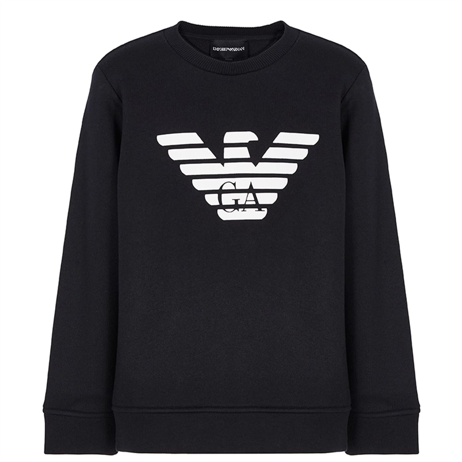 The Emporio Armani Eagle Logo Sweater is a great addition to your casual wardrobe, crafted with a crew neck collar, long sleeves and a ribbed trim to the wrist cuffs and hem that provides all day comfort, a large printed logo of the Emporio Armani Eagle to the chest gives a stylish look, completed with the Emporio Armani branding. -