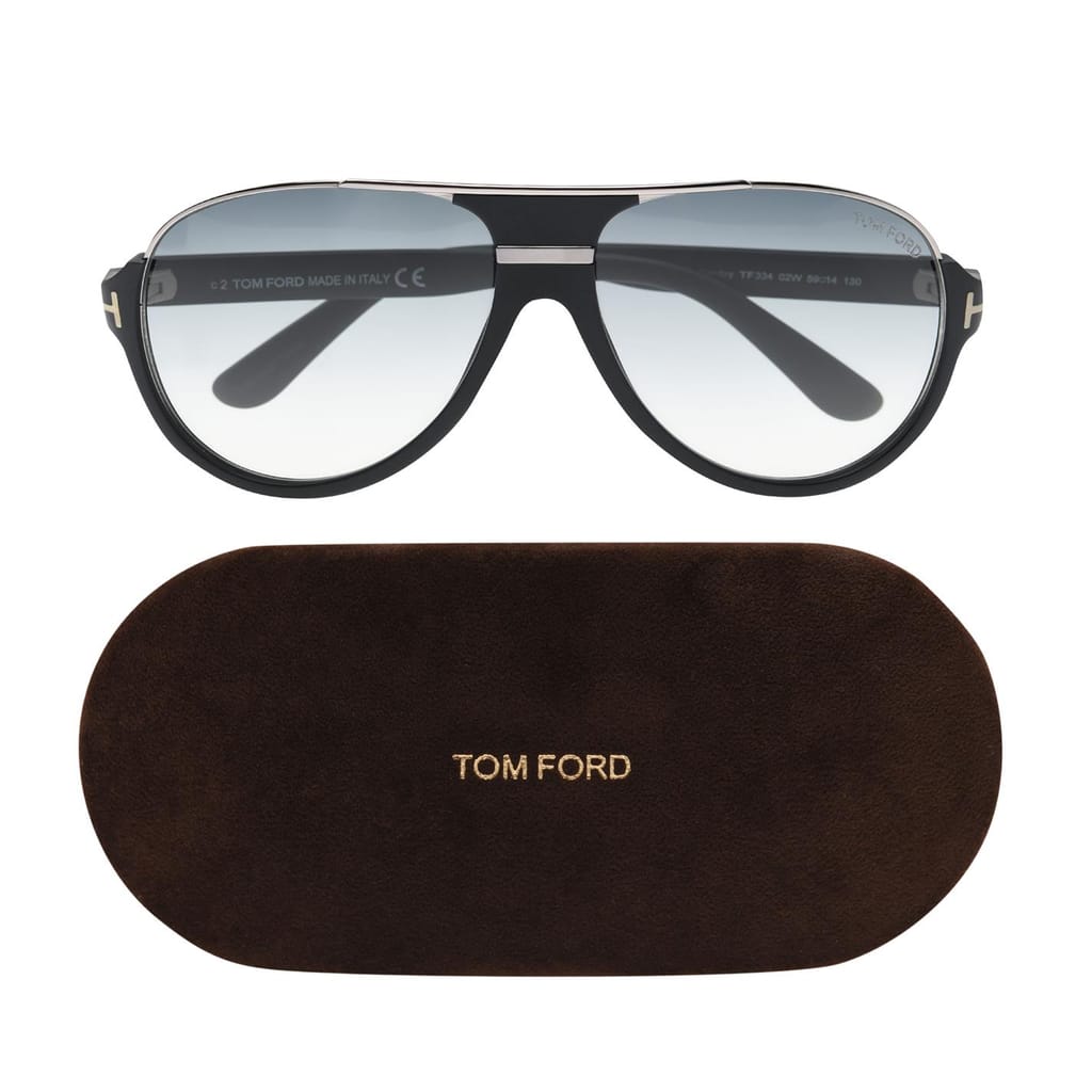 Finish your sunny day style with these Tom Ford Dimitry Vintage Aviator Sunglasses. Crafted with a rounded aviator frame, this pair feature tonal UV protected lenses with silver-toned metal trims to the top of the brow bar and a logo engraved plaque to the tip of the arms before finally being stamped with the signature T's to the temples for a sleek luxurious look. Accompanied with a protective branded case and matching wipe cloth.