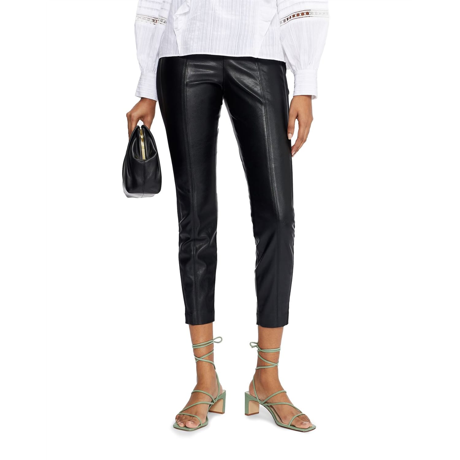 These faux leather leggings add a little edge to your outfit come cocktail hour. With a pleat detailing, tonal stitching throughout and an elasticated waistband for comfort and ease, style with a chunky knit for day or a fringe top and heels for evening. -
