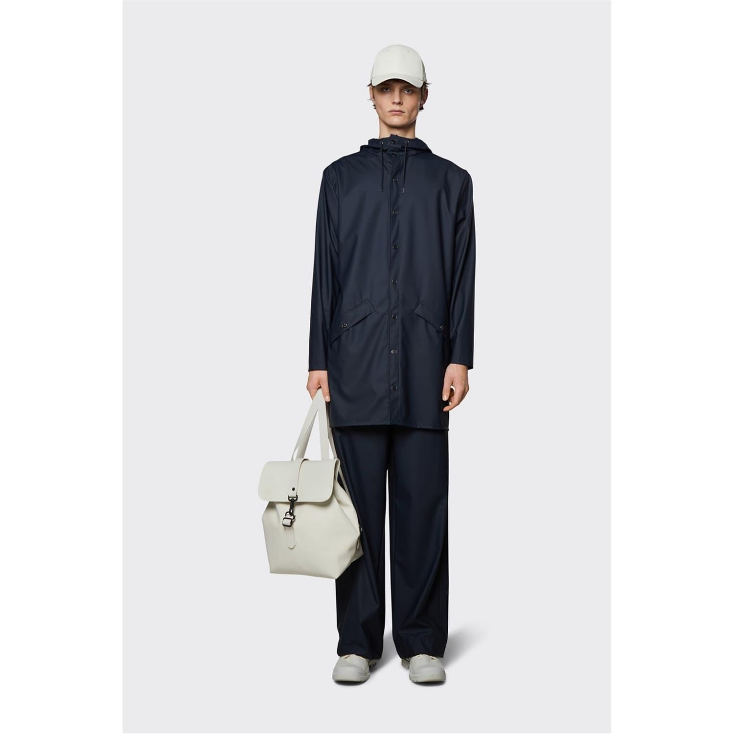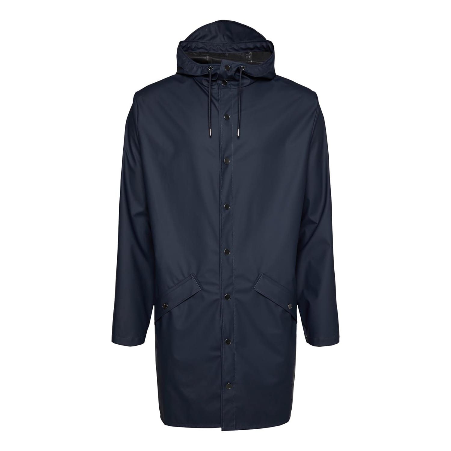 - This rain jacket is a long version of Rains' classic rain jacket. It features a placket with snap fastenings for closure, hood with built-in cap and two side pockets with snaps. Sleeves are finished with snaps making them adjustable for a loose or tight fit.