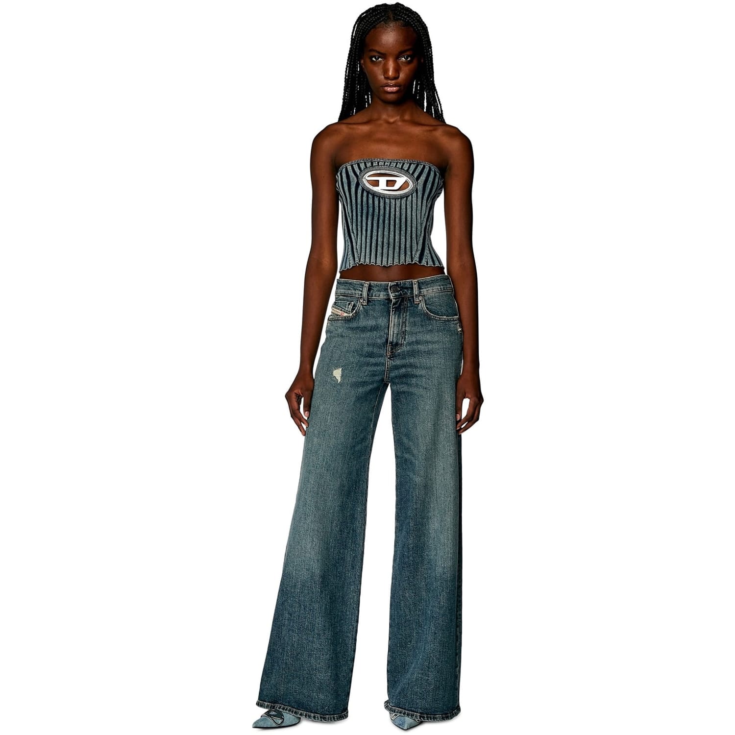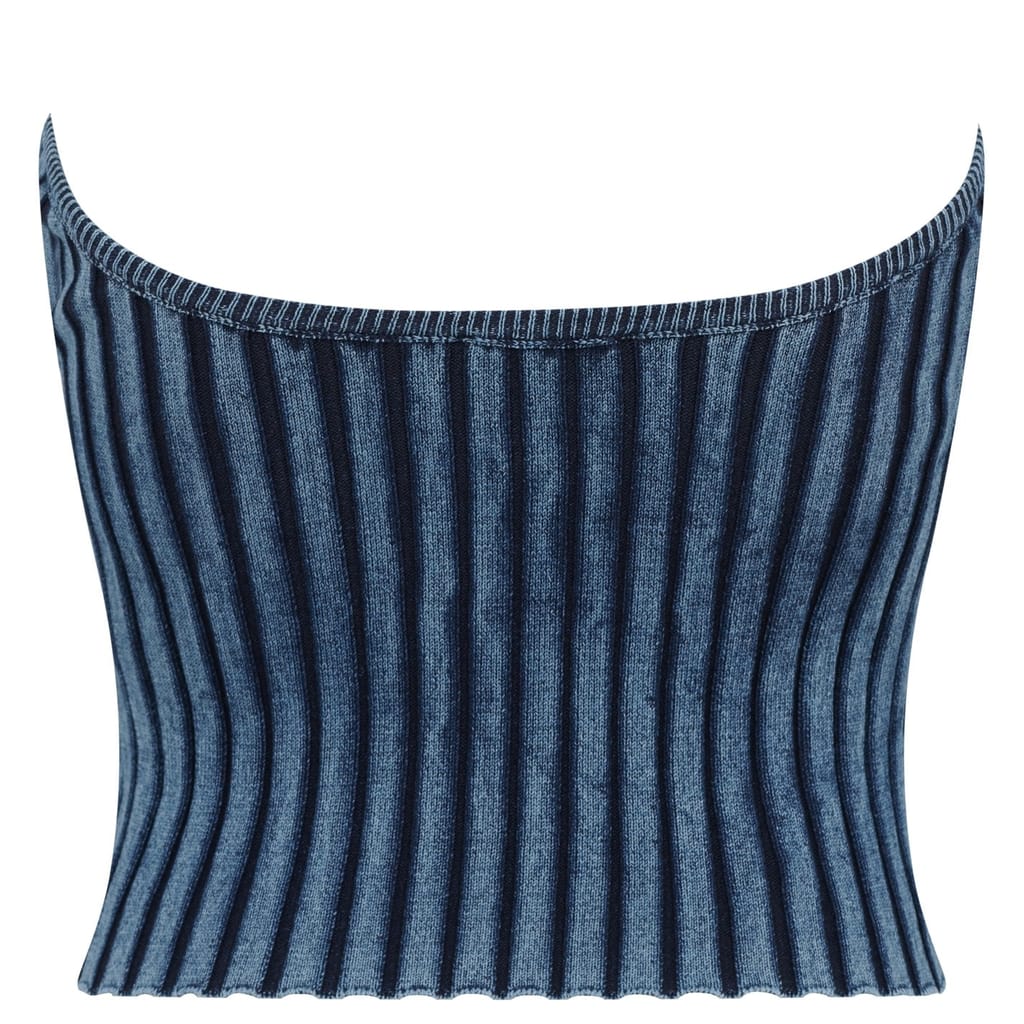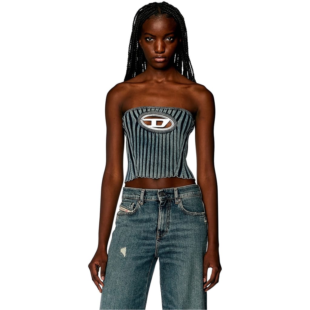 Add a y2k aesthetic to your wardrobe with the Boucle Bandeau from Diesel. Taken from the SS22 Fashion Show Capsule, this top offers a strapless cut and cropped length to create a classic flattering silhouette. Made from a stretch cotton blend for comfort, this top is designed in a ribbed construction and denim-style stonewash for a well worn look. Finished with an enamelled metal 'D' plaque to the chest creating a peek-a-boo effect, style yours with a mini skirt and chunky shoes for an on trend 00's look.