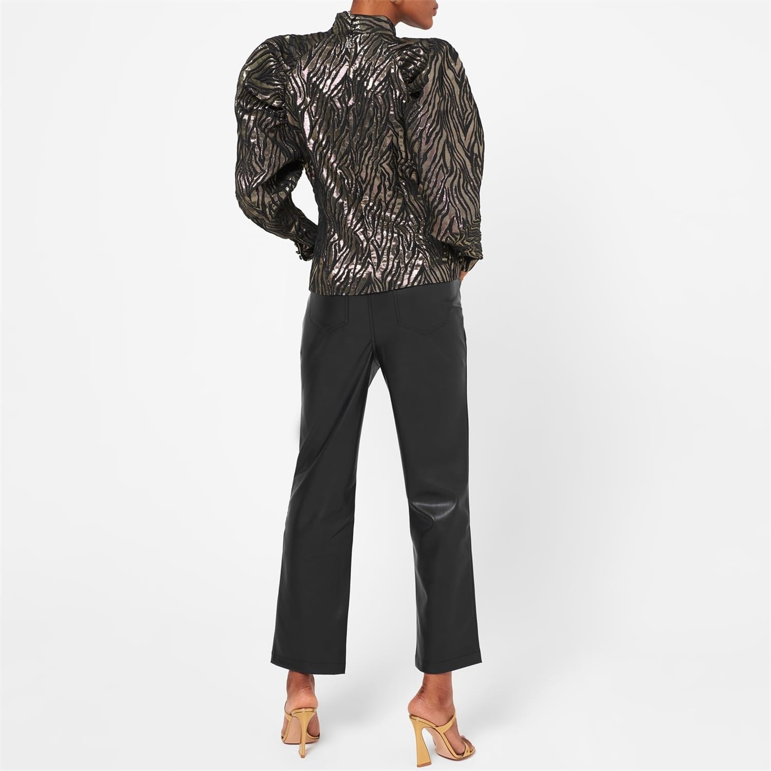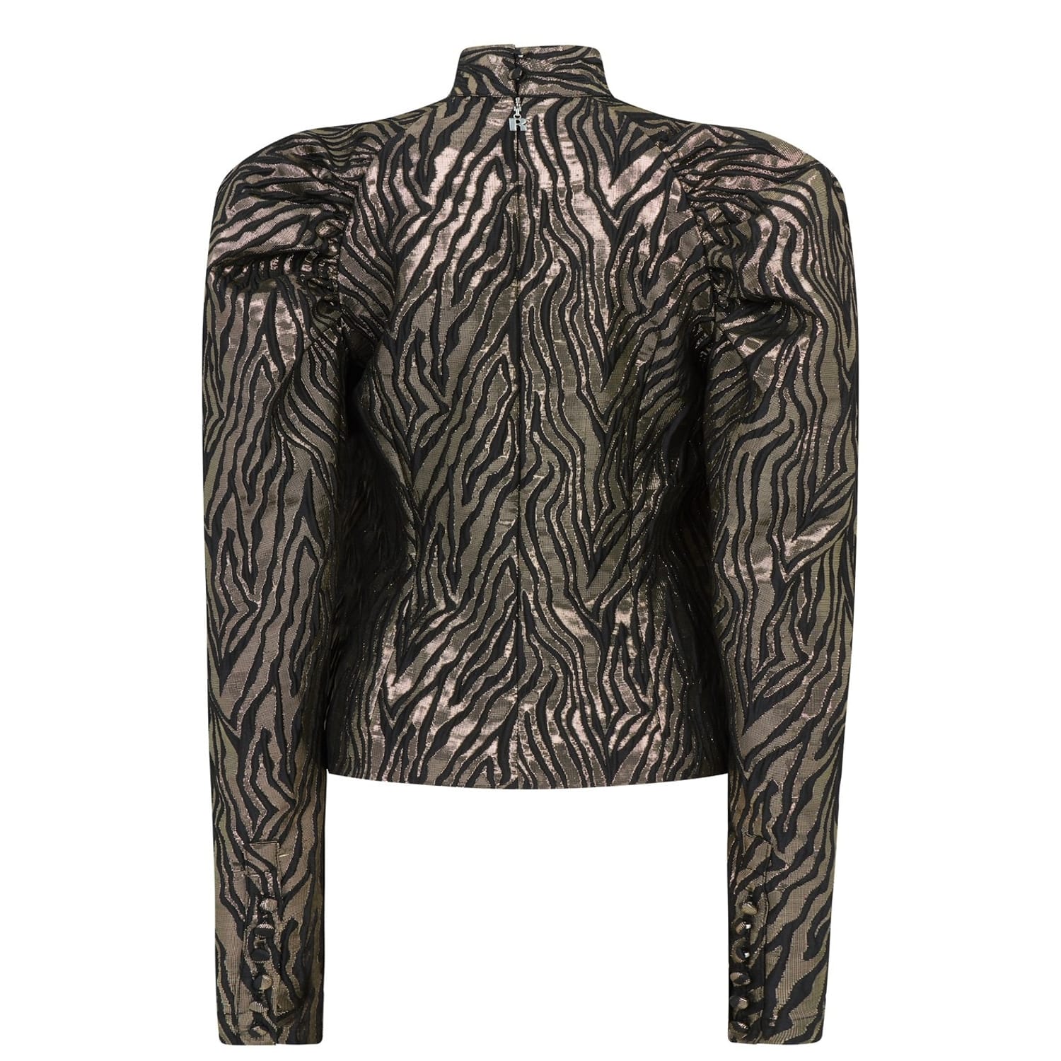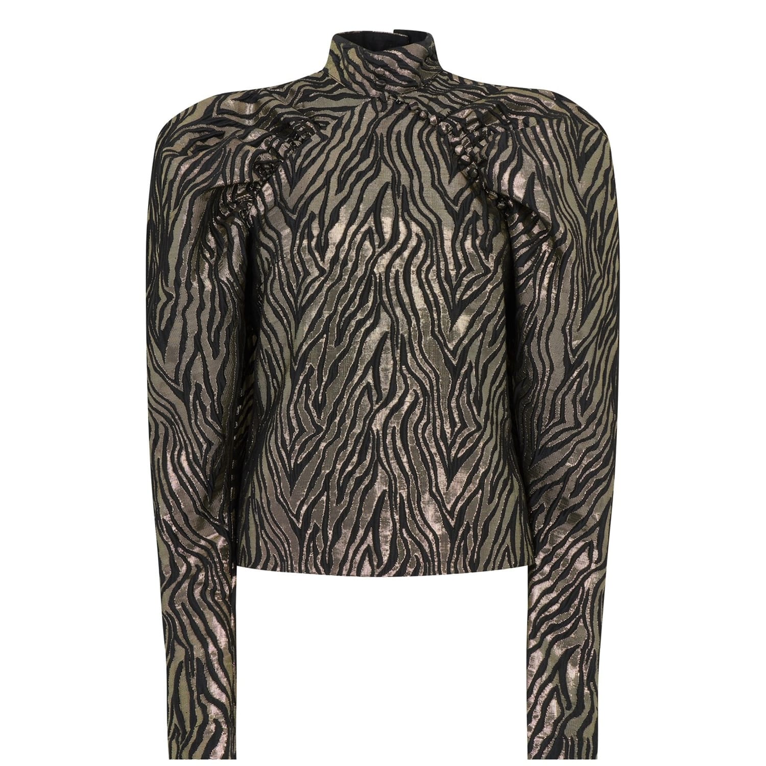 The Kim Top from Rotate is the perfect silhouette for a contemporary meets vintage piece. Constructed from a metallic animal print fabric for a feminine look. the top is crafted with a high standing collar, voluminous shoulders leading to fitted faux-buttoned cuffs and a back button fastening. Wear with faux leather leggings and black heeled boots with a clutch bag, for those evening restaurant dates.