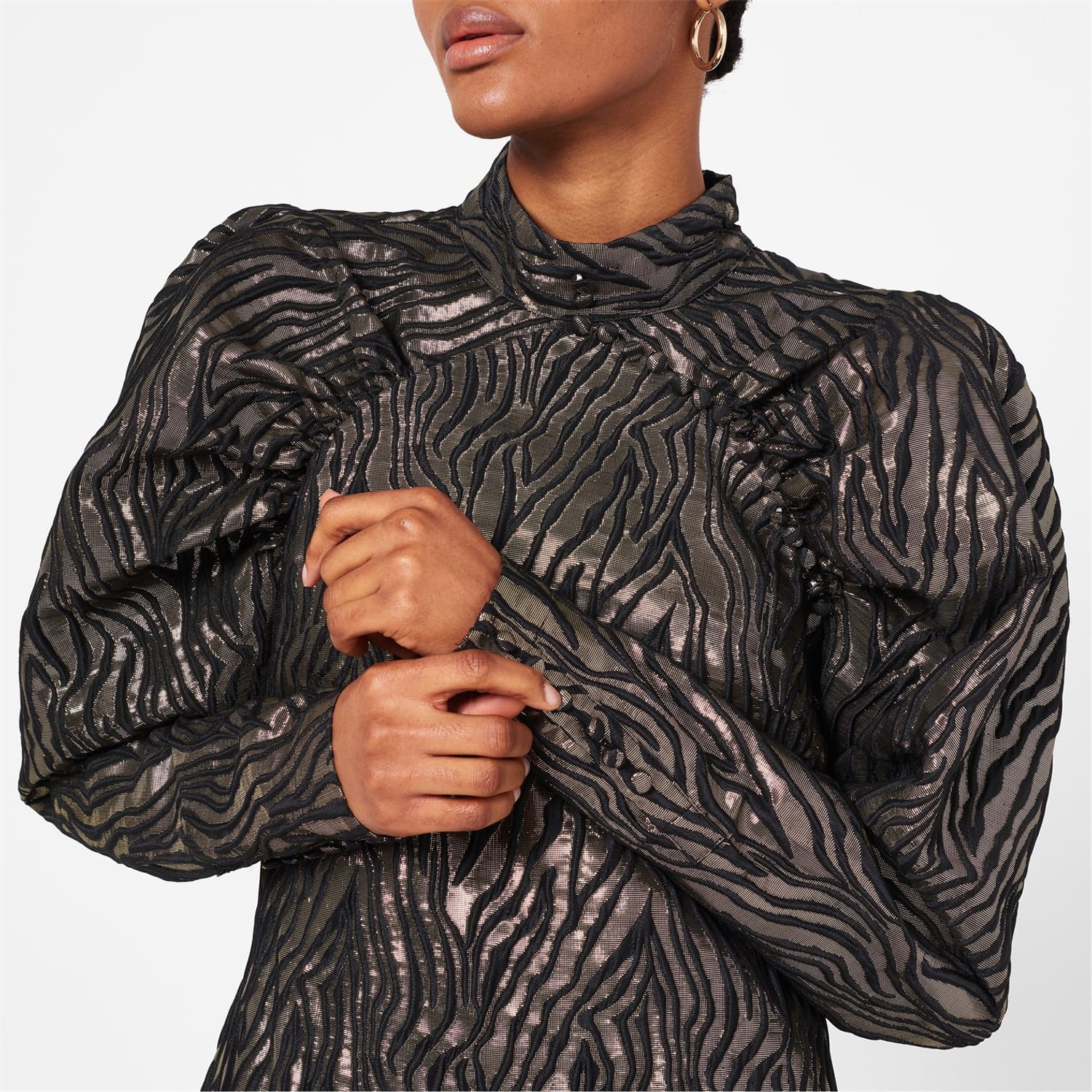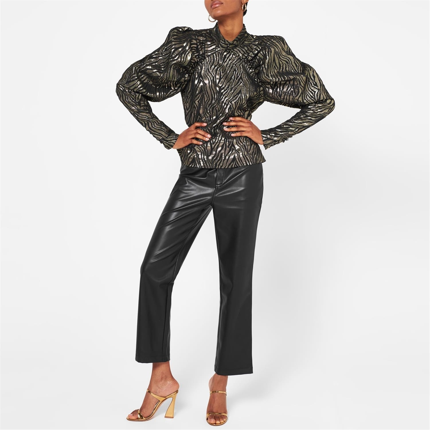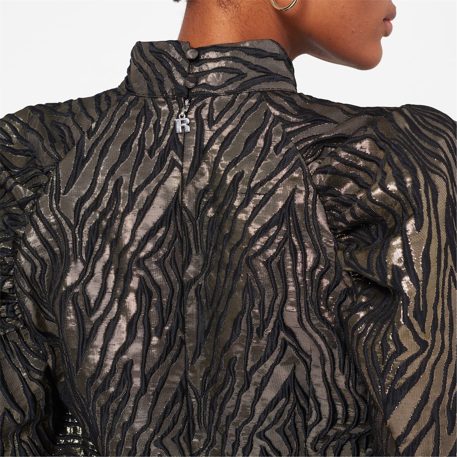 The Kim Top from Rotate is the perfect silhouette for a contemporary meets vintage piece. Constructed from a metallic animal print fabric for a feminine look. the top is crafted with a high standing collar, voluminous shoulders leading to fitted faux-buttoned cuffs and a back button fastening. Wear with faux leather leggings and black heeled boots with a clutch bag, for those evening restaurant dates.