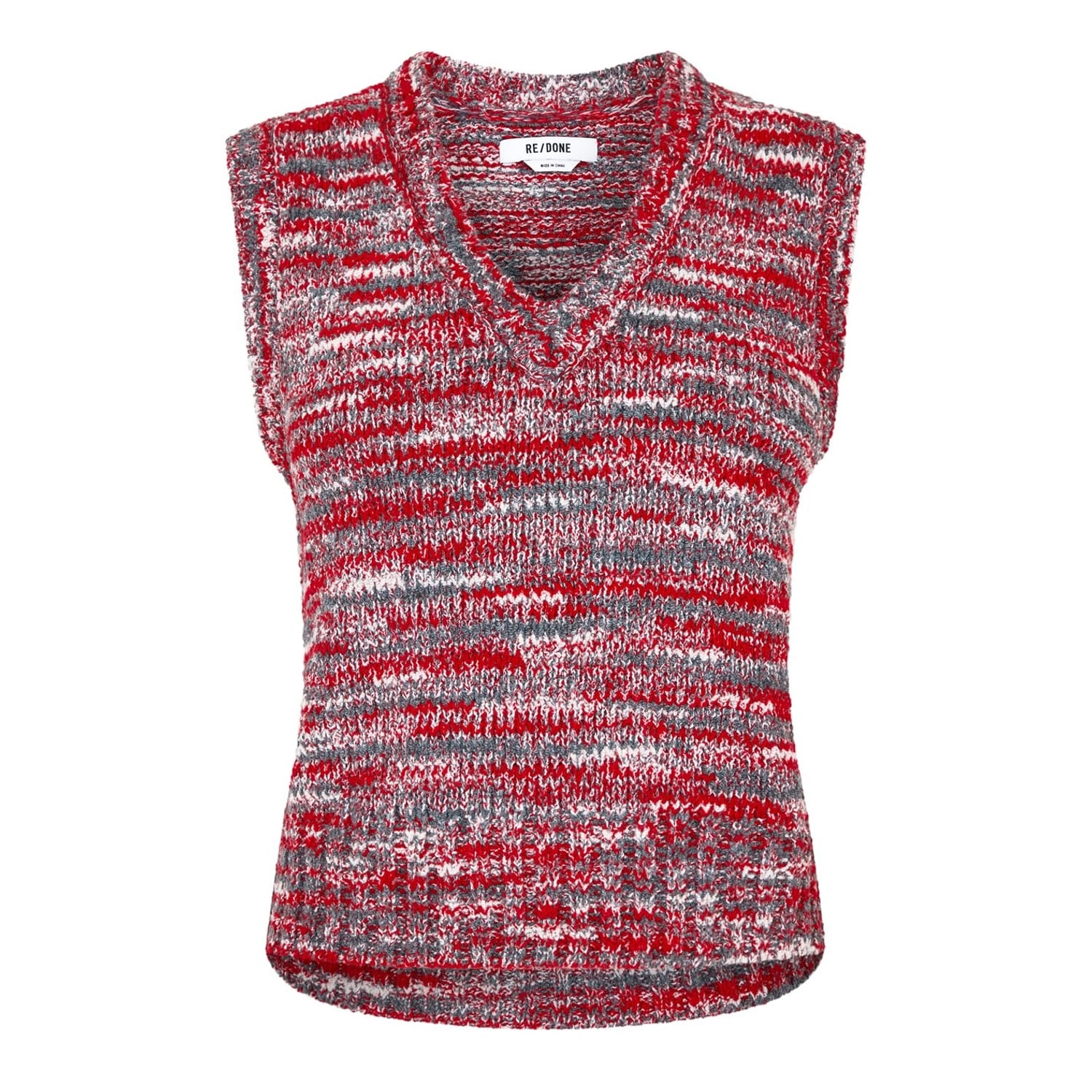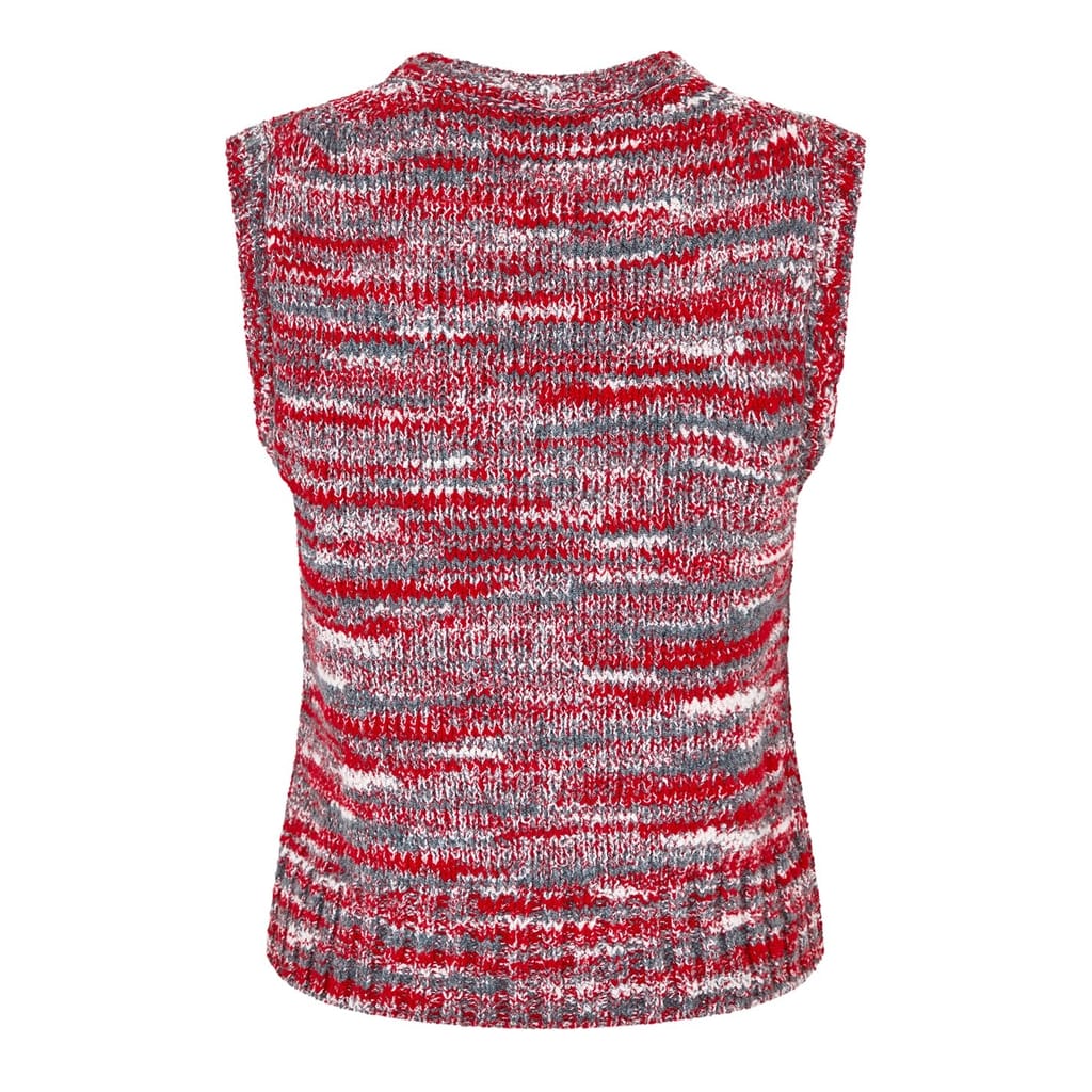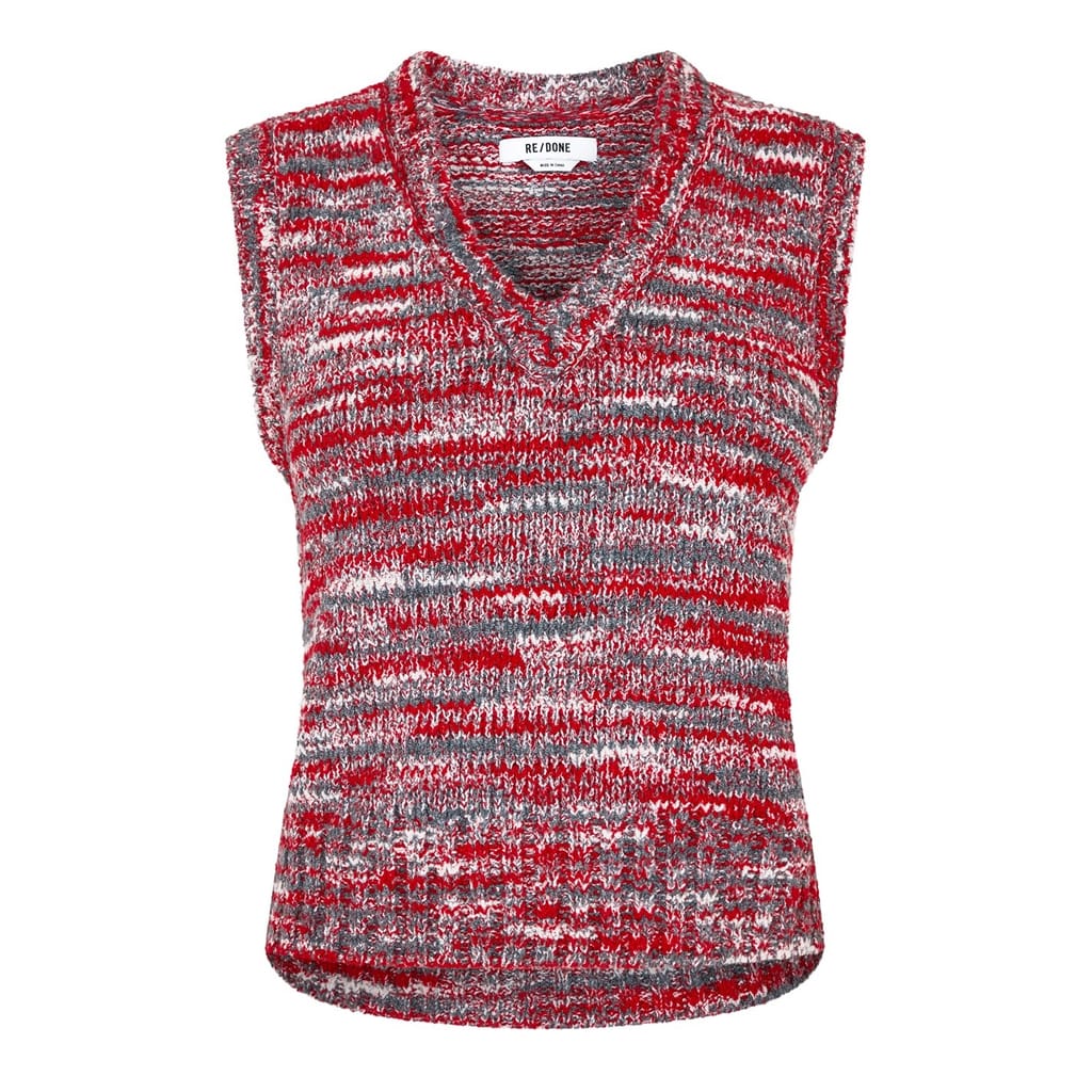 Refresh your sweater collection, with this fashionable sweater vest from Redone. Crafted from a recycled wool mix, this chunky knit styled garment comes in a slightly cropped style and sports a v neckline for a more comfortable stylish wear. It comes in a sleeveless design and features ribbed trims to detail. The look is completed in a 60s style aesthetic, multicoloured red design and would be a perfect addition to your everyday wear. Materials: 50% recycled polyamide ,23%viscose 13% recycled wool, 4% cashmere. Hand wash cold, see other care instructions.