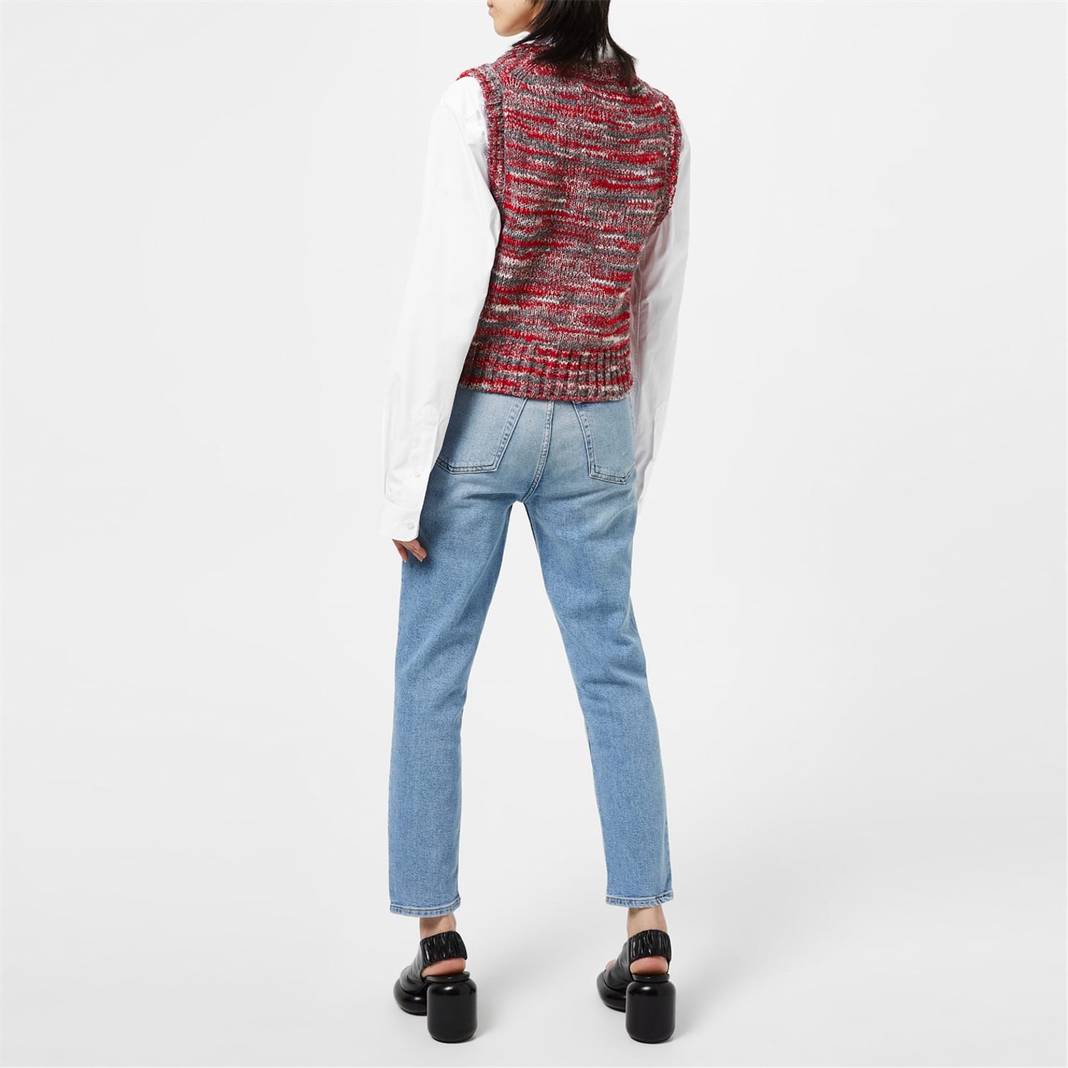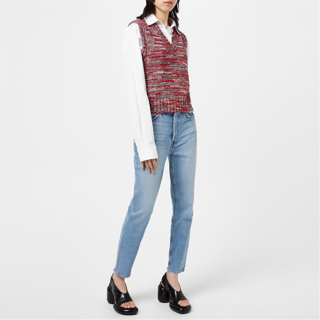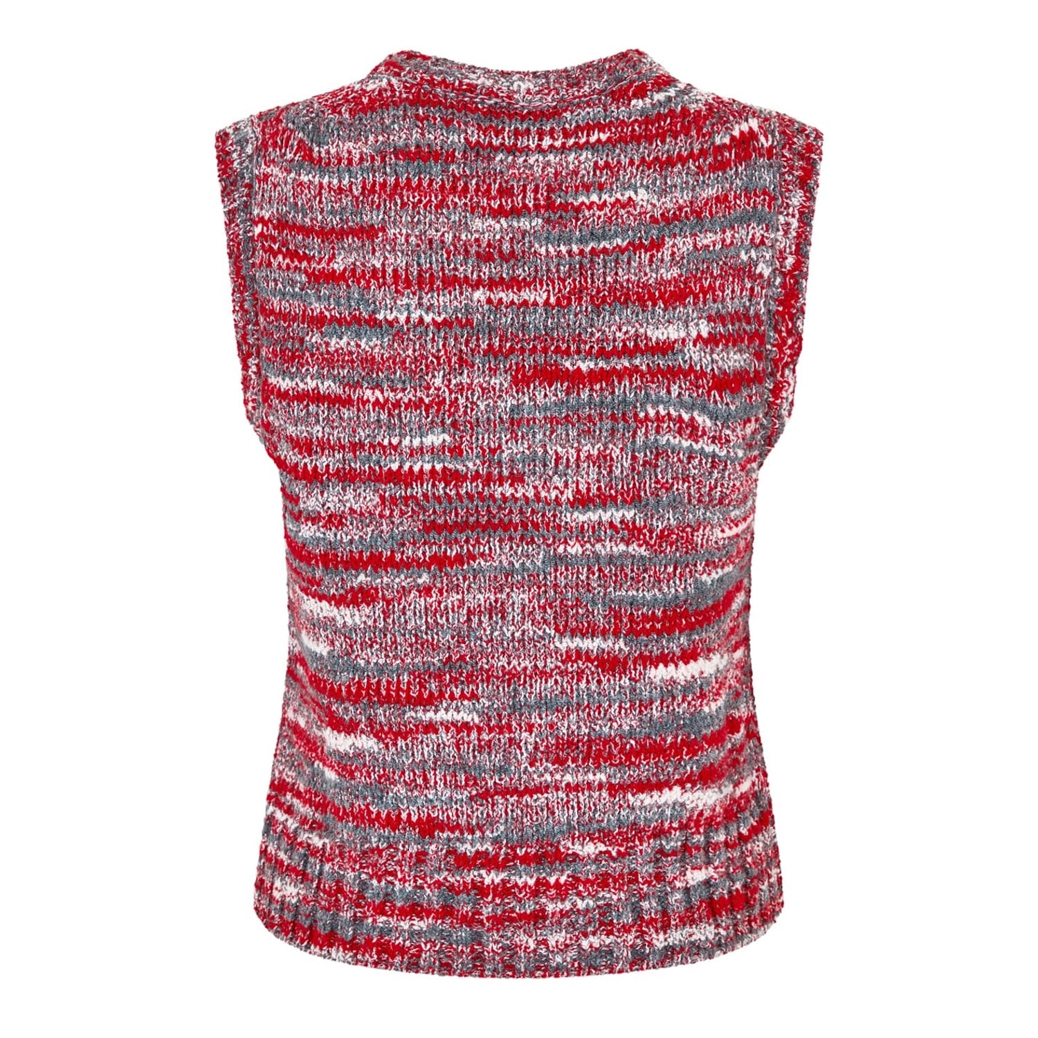 Refresh your sweater collection, with this fashionable sweater vest from Redone. Crafted from a recycled wool mix, this chunky knit styled garment comes in a slightly cropped style and sports a v neckline for a more comfortable stylish wear. It comes in a sleeveless design and features ribbed trims to detail. The look is completed in a 60s style aesthetic, multicoloured red design and would be a perfect addition to your everyday wear. Materials: 50% recycled polyamide ,23%viscose 13% recycled wool, 4% cashmere. Hand wash cold, see other care instructions.