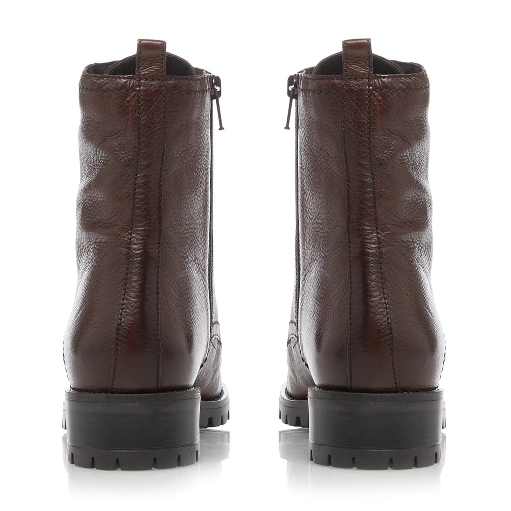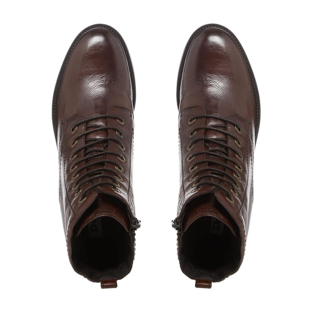 Dune presents the Prestone Ankle Boots, the perfect day-to-night footwear. Crafted from supple leather, these boots for women feature classic round toes and lace fastenings on the vamps, while pull tabs on the heels and inner size zips on the shafts ensure a secure and comfortable fit. Cleated rubber heels are defined by low block heels for a subtle leg-lengthening look.