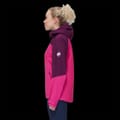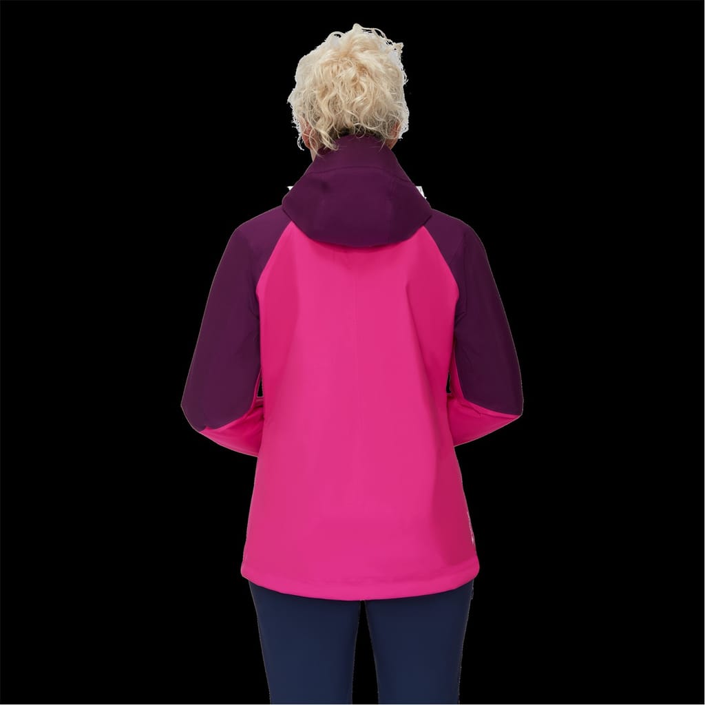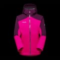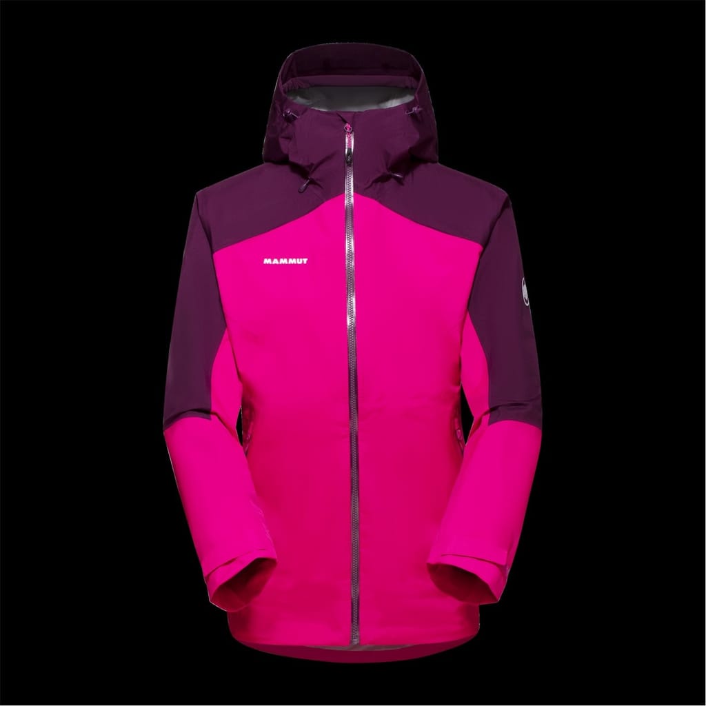 The Mammut rain jacket features a hooded neckline and a zipper closure, offering a regular fit. Designed with a water-repellent finish, it showcases a stylish color block pattern. The jacket is adorned with a logo embellishment, adding a touch of brand identity. -