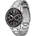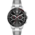 BOSS gents chronograph watch from the Allure family. Featuring a 44mm stainless steel case, black sunray dial with red and white accents, and stainless steel bracelet with push button deployment. Water resistant to 5ATM
