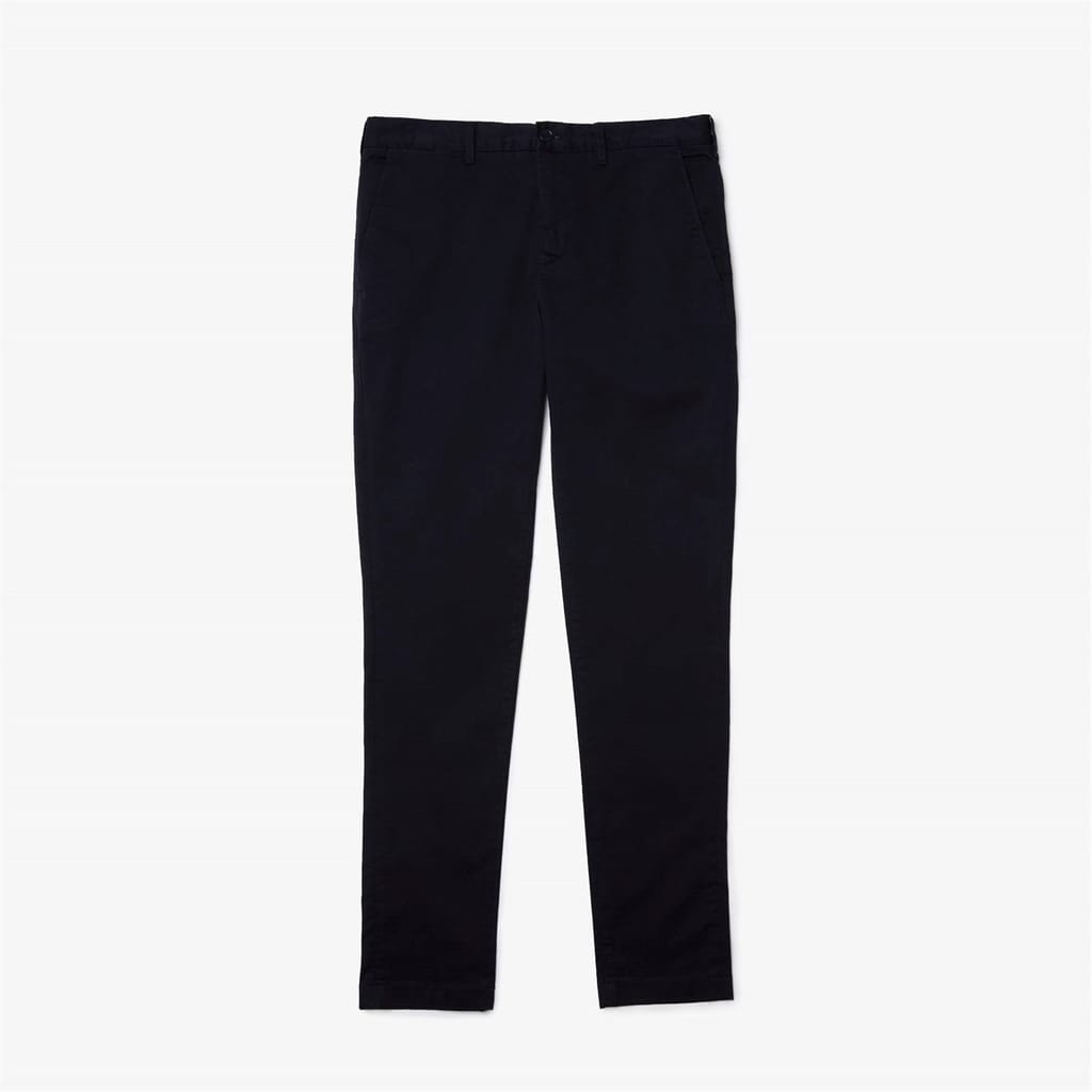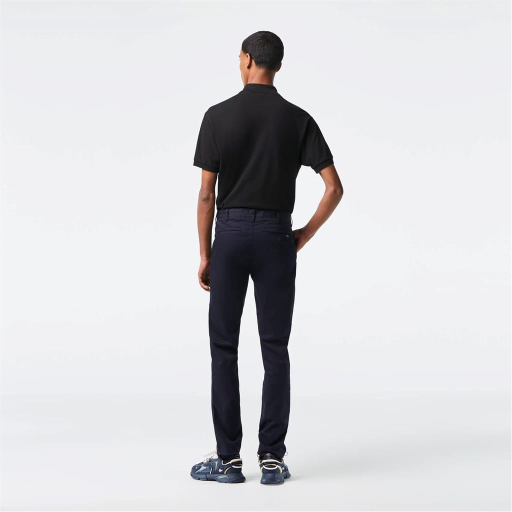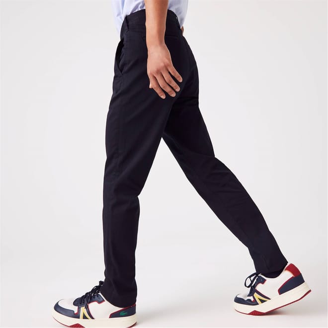 The essential trouser of a Lacoste wardrobe. Timeless chino for a casual look. Made of the ideal weight of stretch fabric it joins Lacoste transitional essential of the masculine wardrobe for a contemporary silhouette. This chino made from organic cotton has been designed in a sustainable approach. Slim fit - Adjusted hip and leg, slightly low waist. Inside waistband made with branded jacquard herringbone and finished by a white binding. Binding at bottom legs