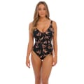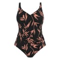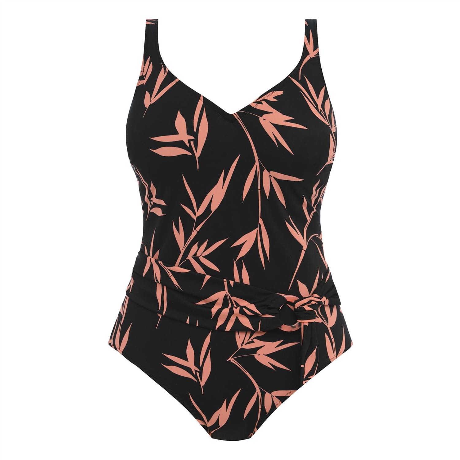 With an oriental inspiration, Luna Bay features silhouetted bamboo leaves in earthy tones of mink on a black ground. This fully lined swimsuit with built up shoulder straps has a flattering deep V-neckline and concealed underwire for support. This style has pared back construction to give a more flexible fit and features a higher leg and lower scoop back for reduced coverage and ease of wear. The waist is accentuated with a wide belt with a tortoiseshell design ring detail.