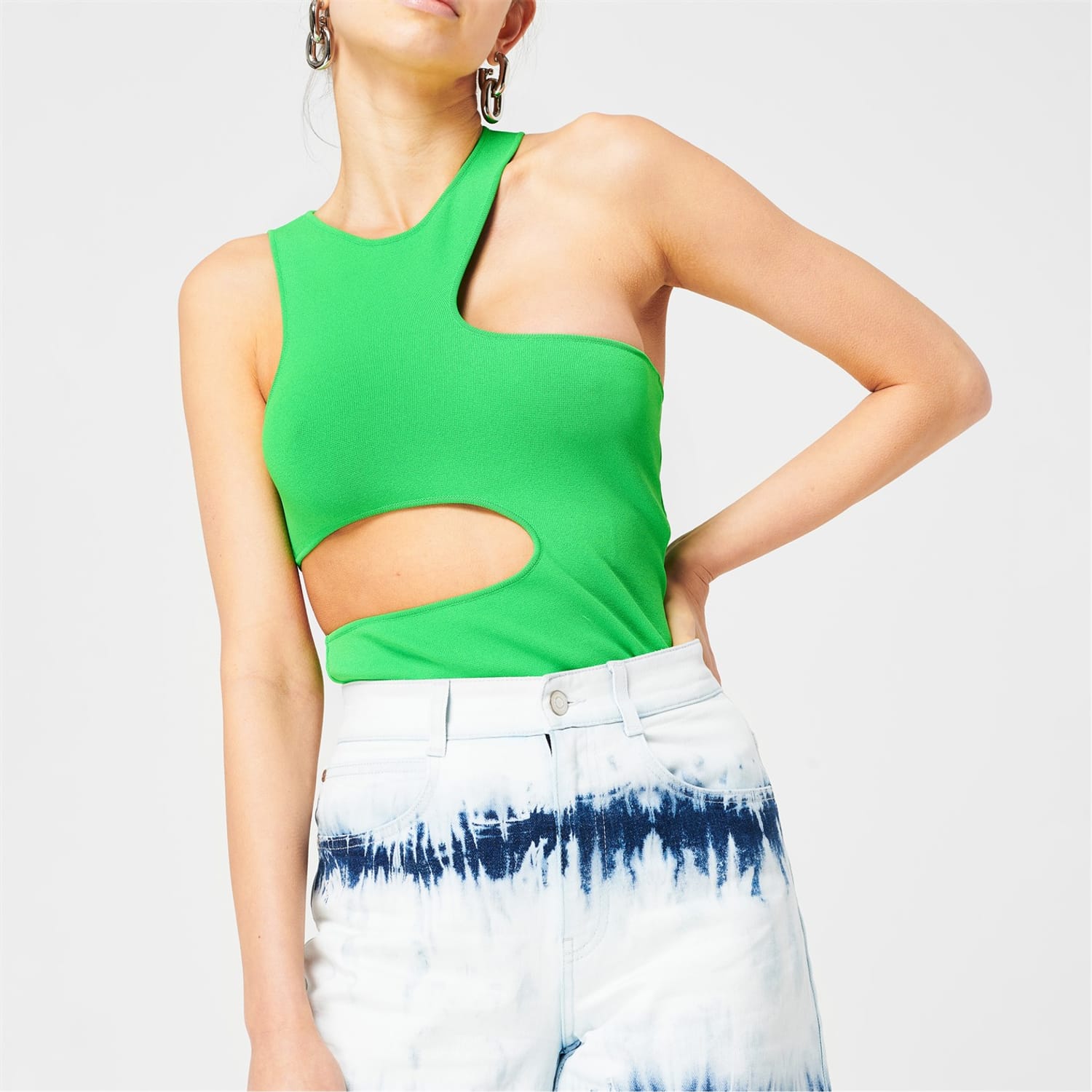 This Stella McCartney tank top features an elegant asymmetric neckline and stylish cut-out embellishments. The solid pattern and sleeveless design offer a sleek, slim fit. With a convenient pull-on closure, this waist-length top is perfect for a chic, modern look. -