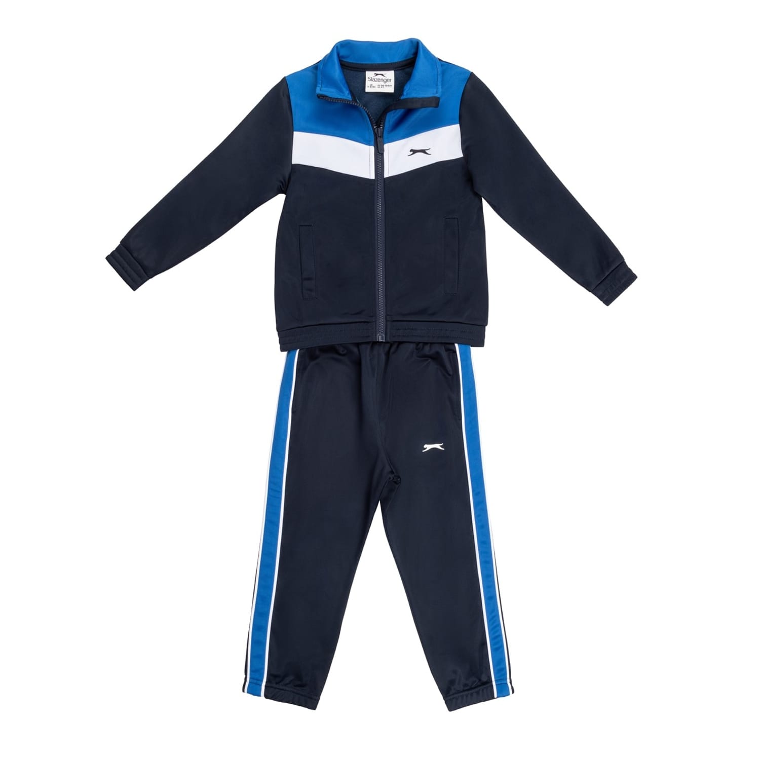 Made from a soft Poly fabrication, this Infants Slazenger tracksuit has been designed with an athletic style in a lightweight and breathable construction. Sold as a set, the jacket has been designed with a three panel colourway, funnel neckline with full zip fastening, two slip pockets and elasticated trims to the cuffs on the long sleeves and straight hemline. Complete with bottoms which detail an elasticated waistband, elasticated cuffs and two slip pockets finished with a striped panel down the side of the legs. Both items have the signature Slazenger logo for brand appreciation. Material Composition: 100% Polyester -