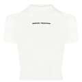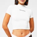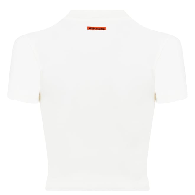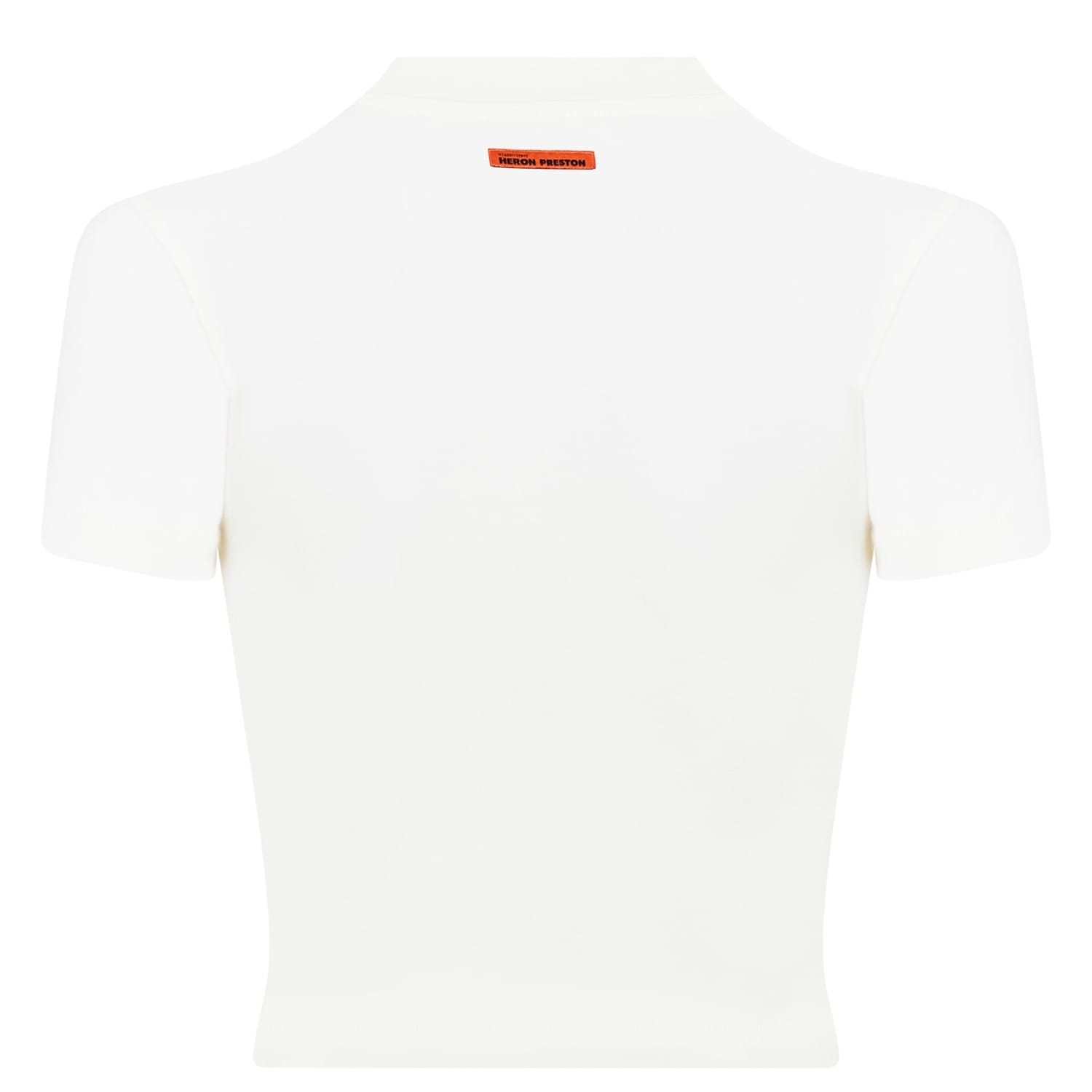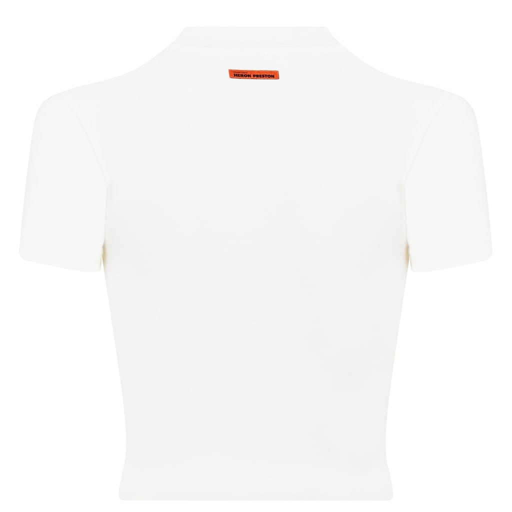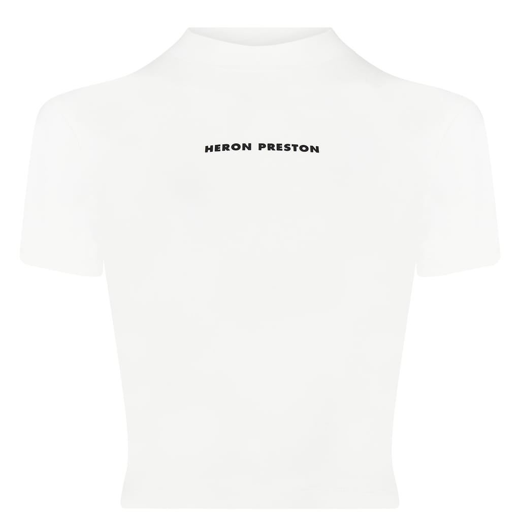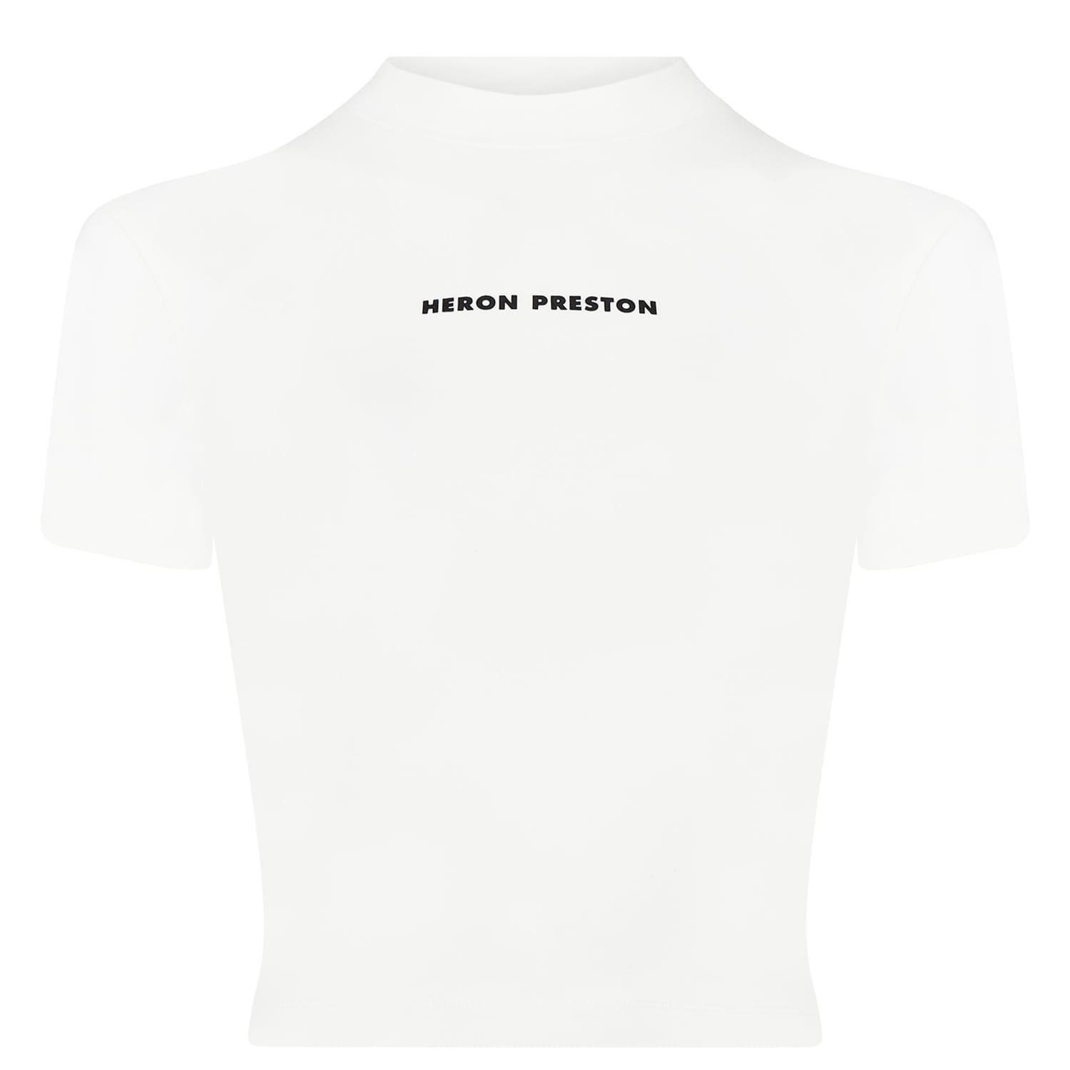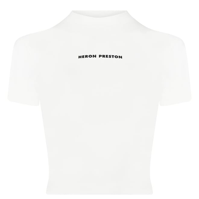 This Heron Preston cropped t-shirt is perfect for casual wear. Featuring a mock neck, short sleeves, and a slim fit, it sports a solid pattern with a logo embellishment. The plain sleeves and straight hem give it a neat look, while the pull-on closure ensures ease and comfort. -