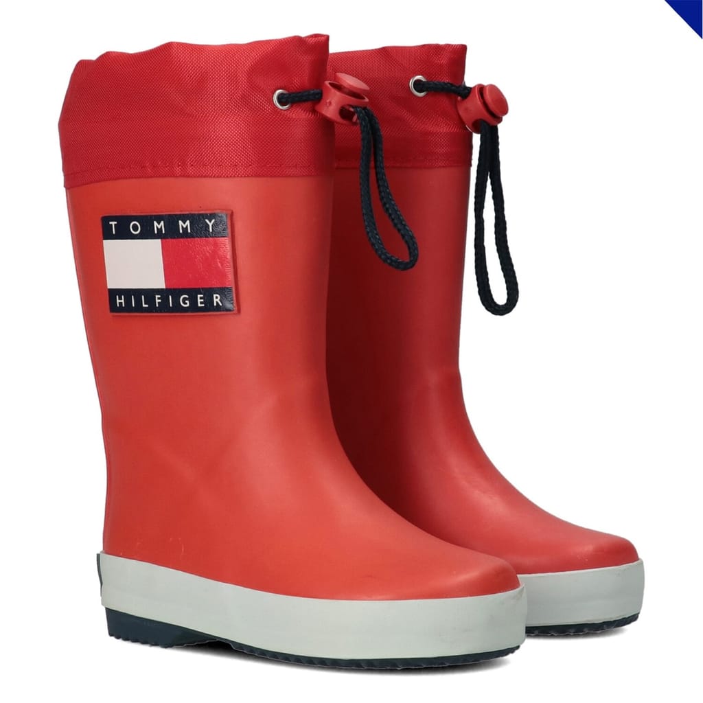 - Update your childs winter attire with the Flag Rain Boot by Tommy Hilfiger. Crafted from a rubber fabrication to the upper, these calf-high boots have a drawstring closure to the upper hem for a secure fit, with a cushioned insole for added comfort. Designed with a rounded toe, this boot has a non-slip sole for all day stability when they're on the go, branded with the signature Tommy Flag logo to the side. -