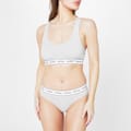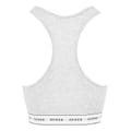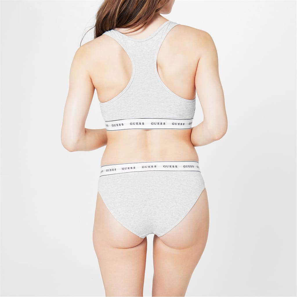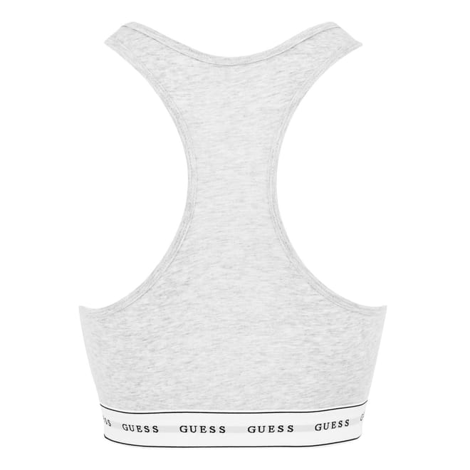 Discover the Guess bralet top, featuring a scoop neckline and sleeveless design. This waist-length bra top is unlined and offers a pull-on closure for easy wear. The heathered, logo-patterned fabric adds a stylish touch, accented with a signature logo embellishment. -