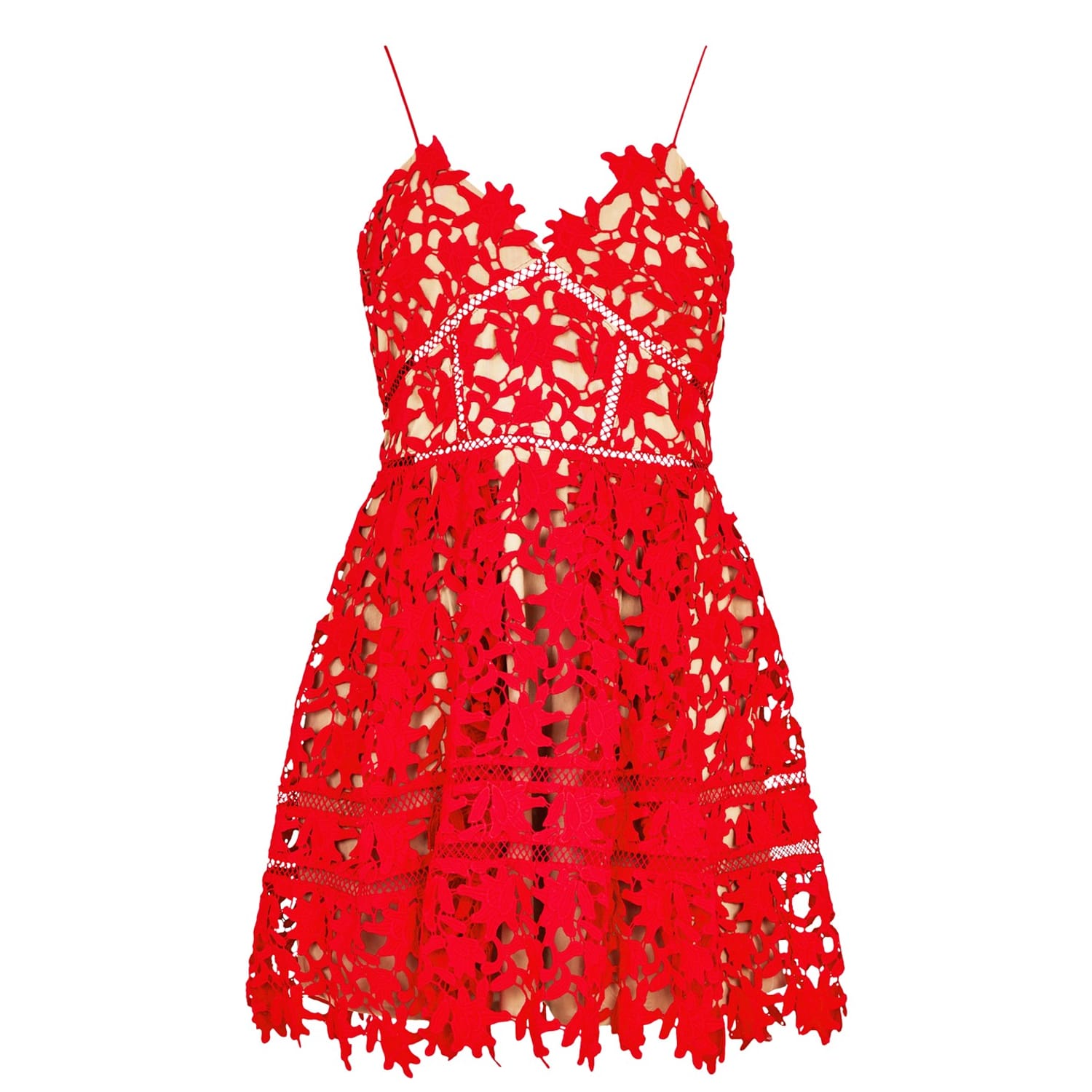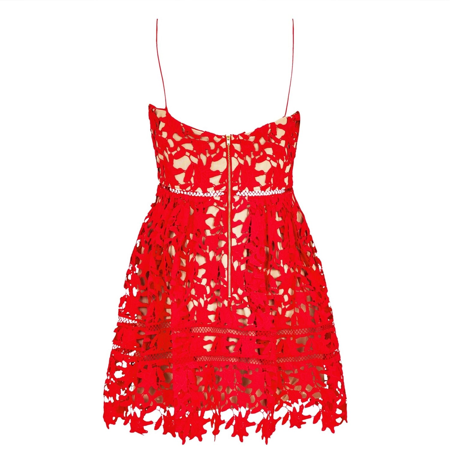 Add a signature piece to your wardrobe with the Self Portrait Azalea Mini Dress. This lace dress is a mini rendition of the famous silhouette from designer Han Chong to fame. Fashioned from guipure supported against a tan mesh lining, the dress is cut to a body-skimming silhouette with pin-thin shoulder straps for a minimalist yet extravagant aesthetic. The dress is secured with a zip and hook fastening to the back for a secure and figure hugging fit.