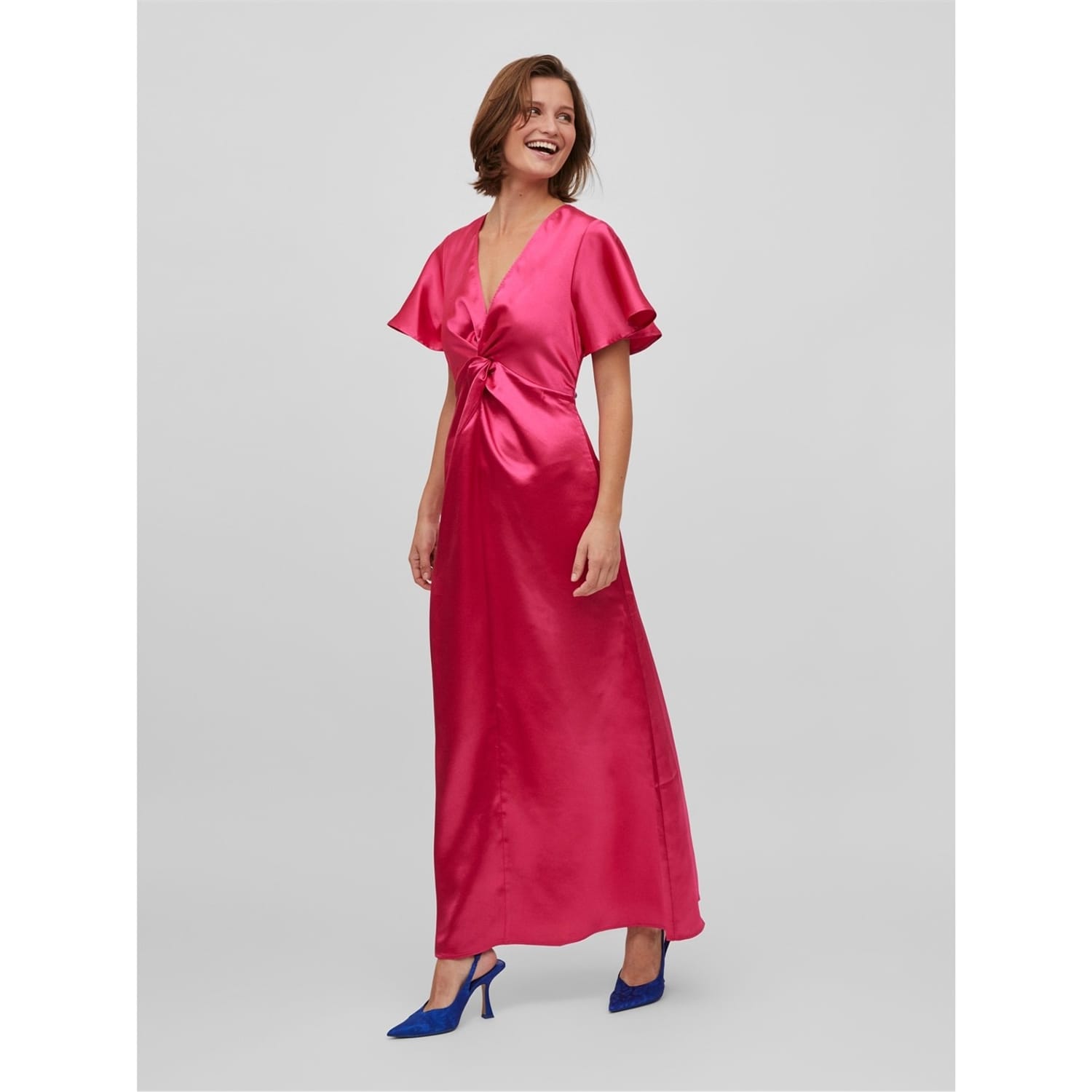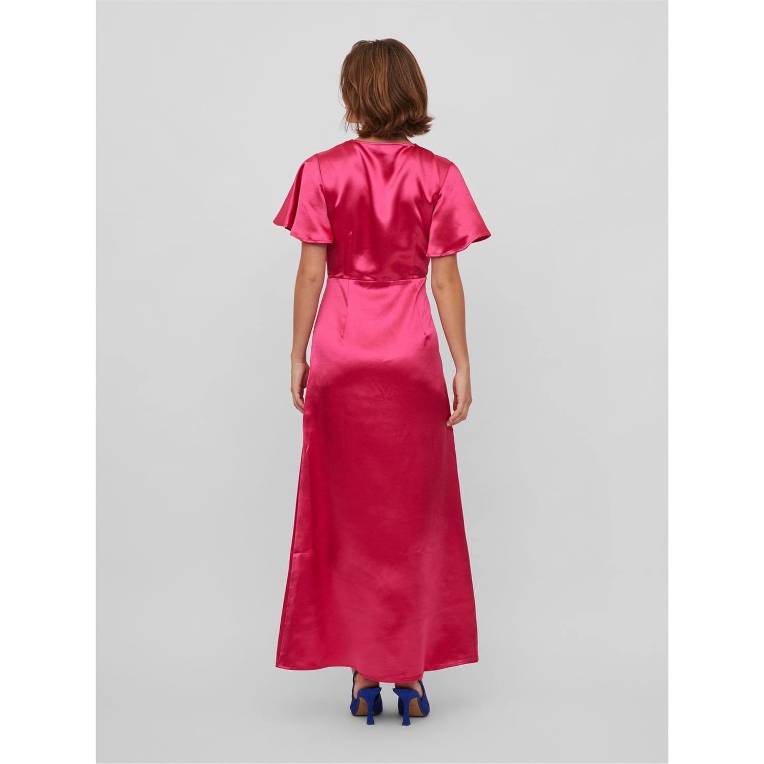 Introducing the Vila maxi dress, a stunning piece featuring a flattering v-neckline and flutter short sleeves. This wrap-style dress offers a regular fit and a straight hem, ensuring both comfort and elegance. The solid pattern and ruched embellishments add a touch of sophistication to this timeless garment. -