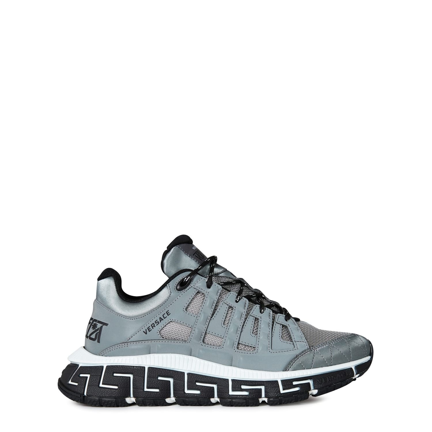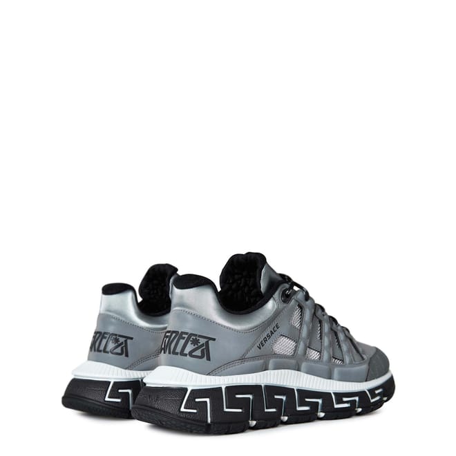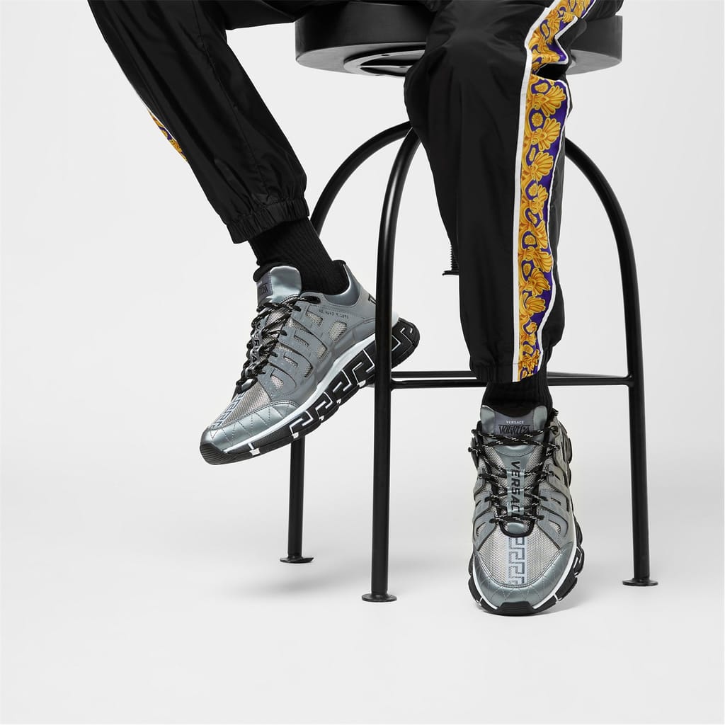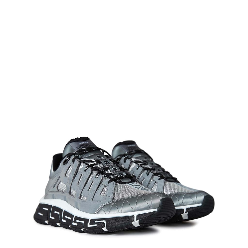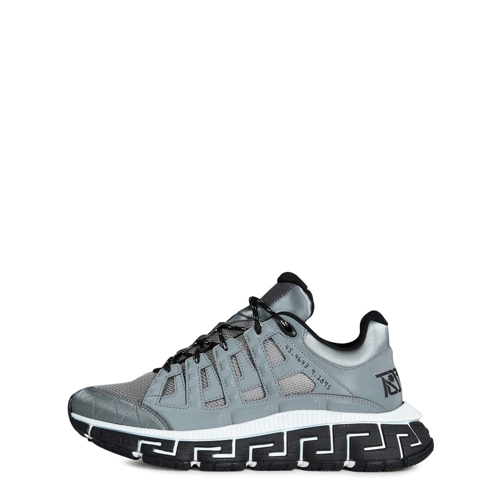 Add an innovative, futuristic shoe to your trainer collection with the Versace Trigreca Trainers. These aesthetically evolved trainers are crafted with 3 main elements. The midsole lateral, medial and bottom outsole combine to create not only a functional cushioning system but also a unique print of the Versace DNA and Milan co-ordinates. You definitely do not want to miss out on these. Dust bag included. Upper: leather/synthetic. Lining: textile. Sole: rubber.