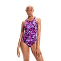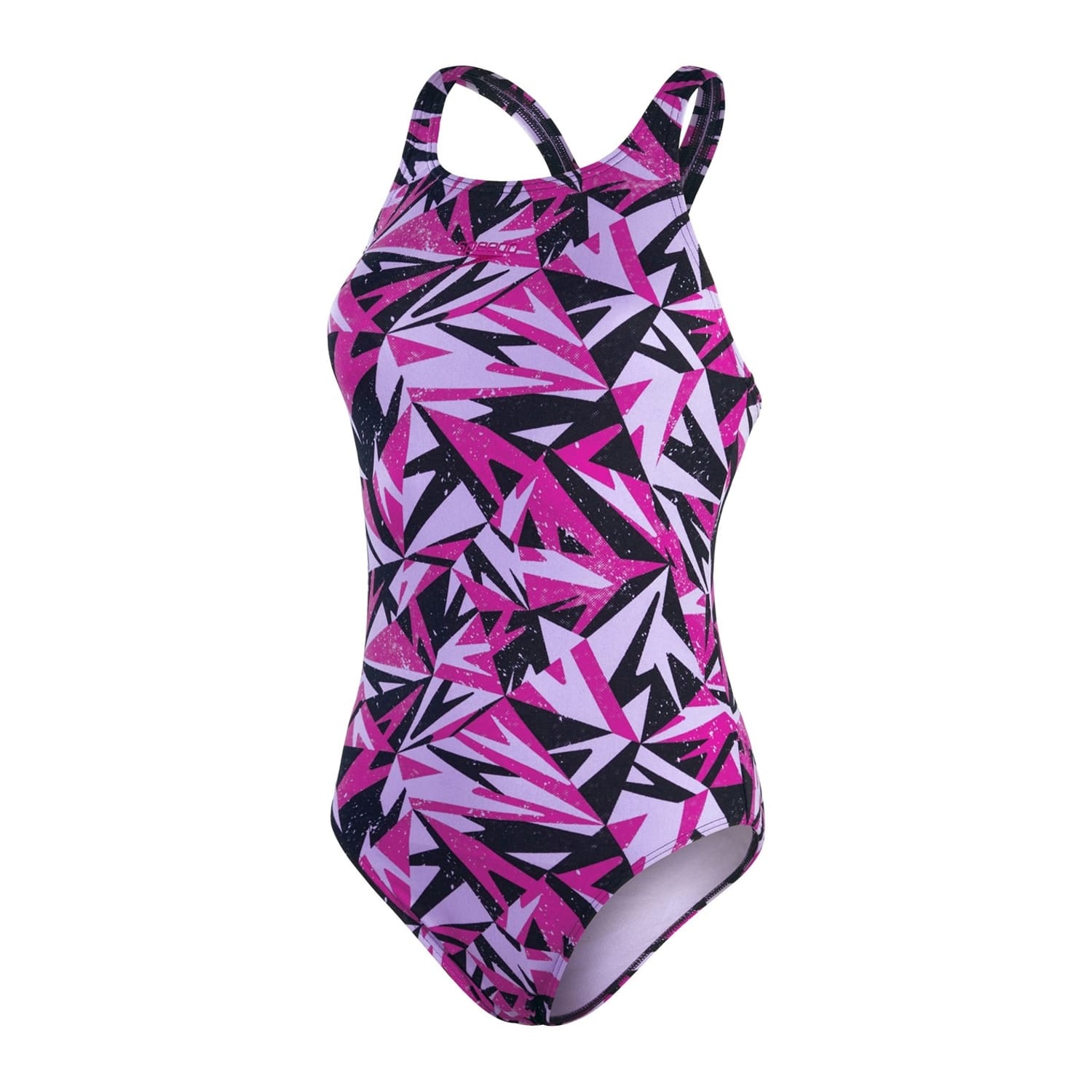 Make a statement in Boom logo prints. Celebrating the Speedo brand, our sporty navy Hyperboom Medalist swimsuit showcases our iconic Boom logo in a ‘shattered’ print design with vivid shades of purple and lilac. Ideal for regular training, the medalist design aids shoulder movement and flexibility so you can cruise through your workout without feeling held back. Made from our ECO Endurance+ fabric, it's quick-drying and 100% chlorine resistant. Plus, one of the yarns in the ECO Endurance+ fabric is made from 100% post-consumer waste, such as recycled plastic bottles. -