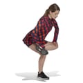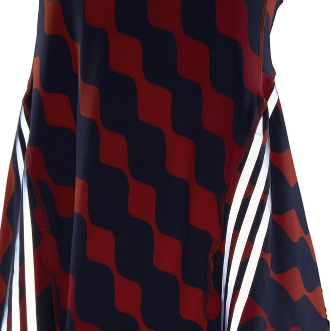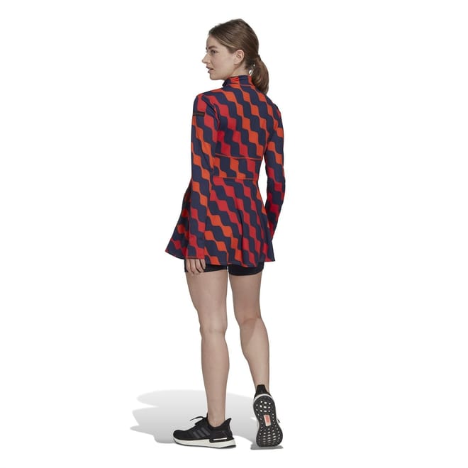 This adidas mini shirtdress features a high collar and a high neck, offering a sleek and modern look. The long sleeves and slim fit create a flattering silhouette, while the curved hem adds a touch of elegance. The dress is adorned with a wave pattern and a subtle logo embellishment. A zipper closure ensures a secure fit, making it a stylish choice for any occasion. -