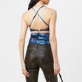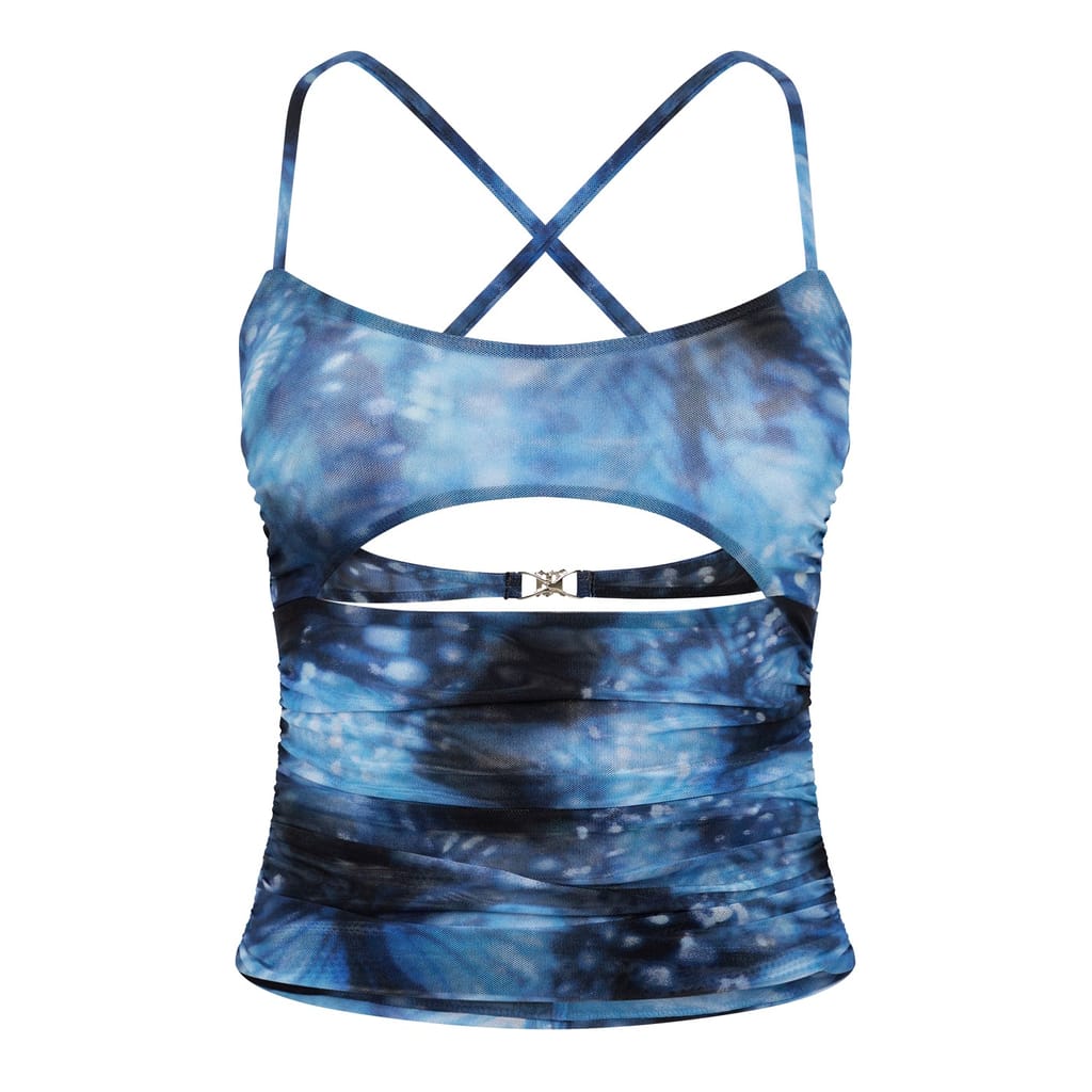 Mystical and modern this eye-catching mesh butterfly top from MISBHV is a must have for your next night out. Evocative of the 90's this mesh top has been experlty crafted from a stretchy polyamide and elastane construction achieving a lightweight, breathable wear that is both contemporary and chic. Framed with adjustable spaghetti, racer back straps for a structured appeal this sultry look is punctuated by the all over tie dye print for a dramatic edge whilst the cut-out detailing in the chest gives this an alluring appeal. Emboldened by the silver-tone monogram clasp closure in the back for a structured edge, whilst the rucheing detail adds a fluid touch. Hand wash.