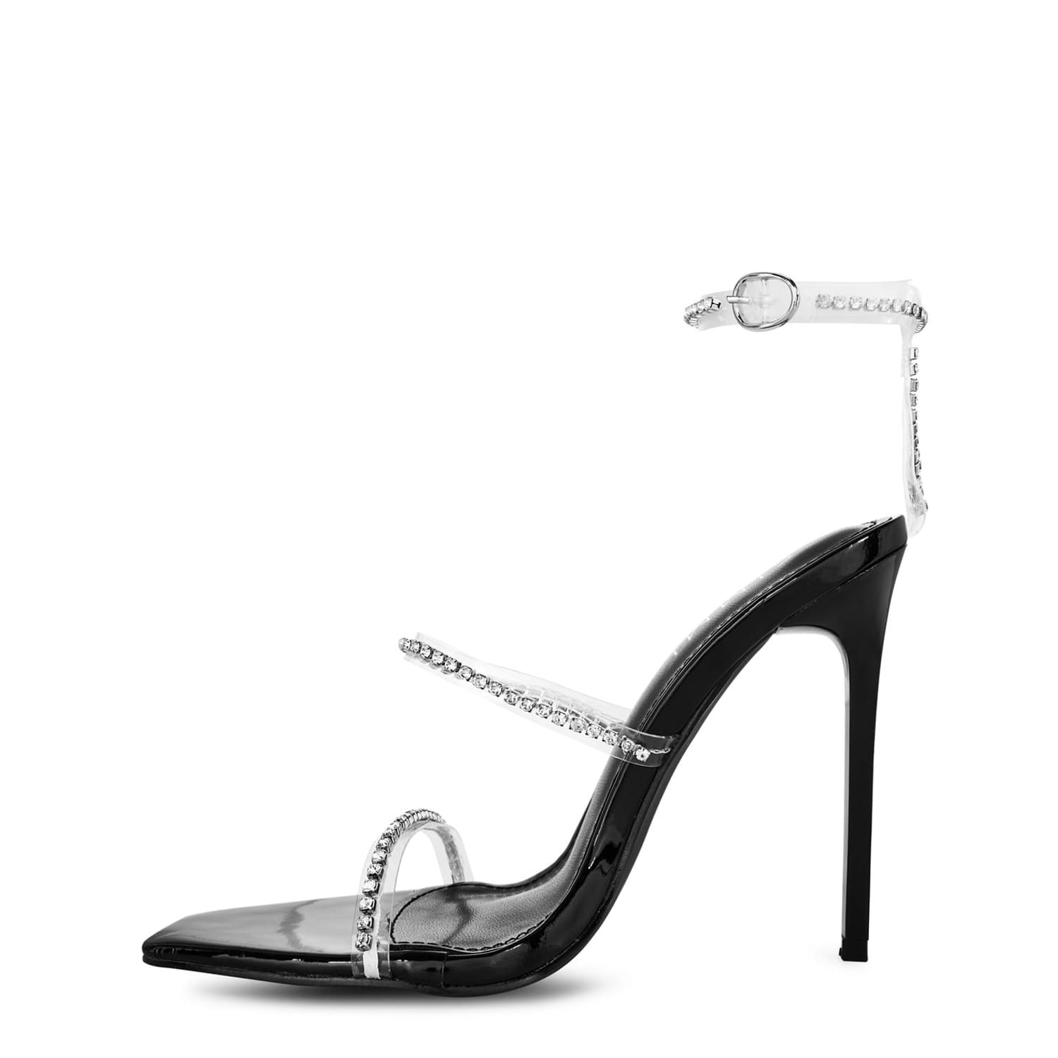 Add some sparkle to your staples with these heels form Simmi. Designed in a silver metallic faux leather, this pair offers a squared toe for a chic and sophisticated silhouette. Sat atop a 4.5 inch stiletto heel to elongate your figure and a buckled fastening to secure your fit, this pair is finished with crystal embellishments adorning the two top straps and ankle strap to create a pair that's made to shine. -