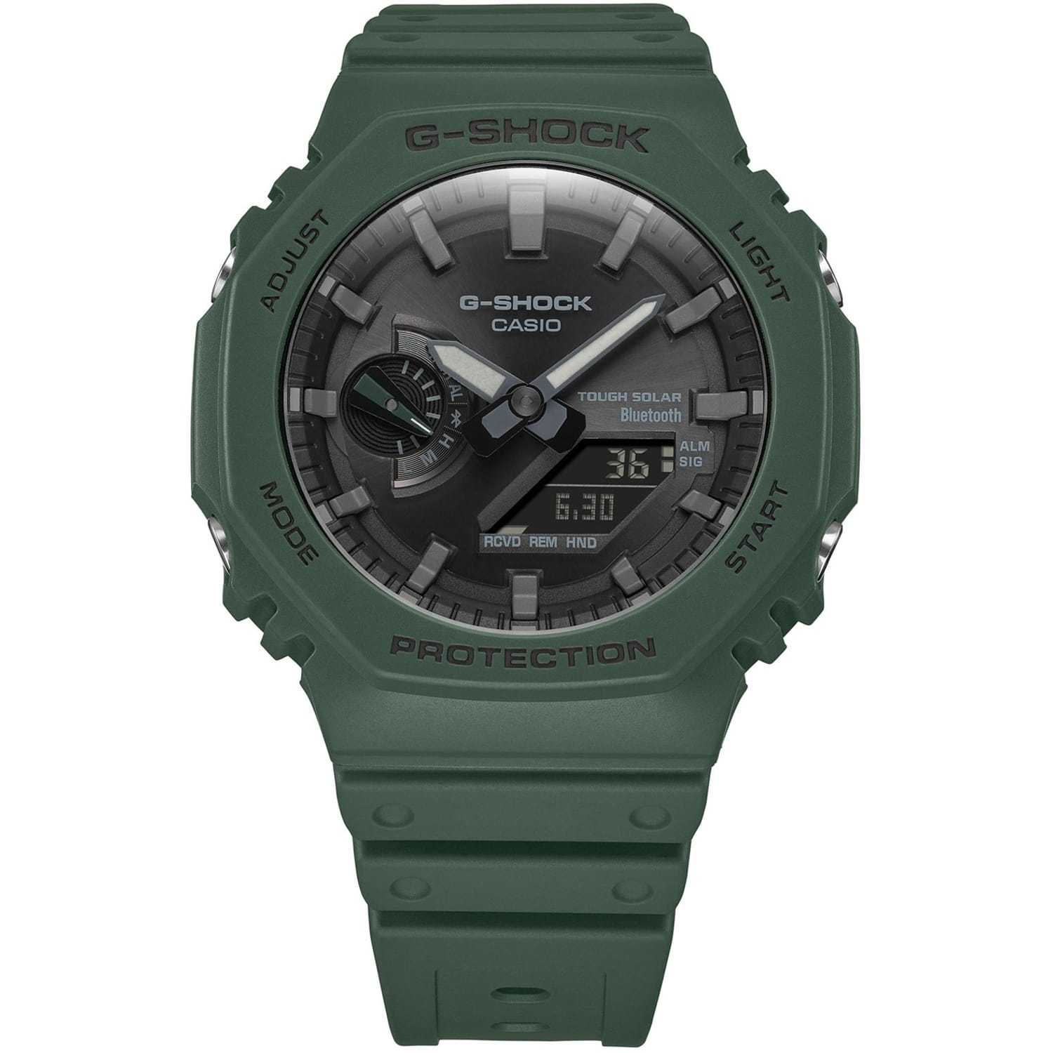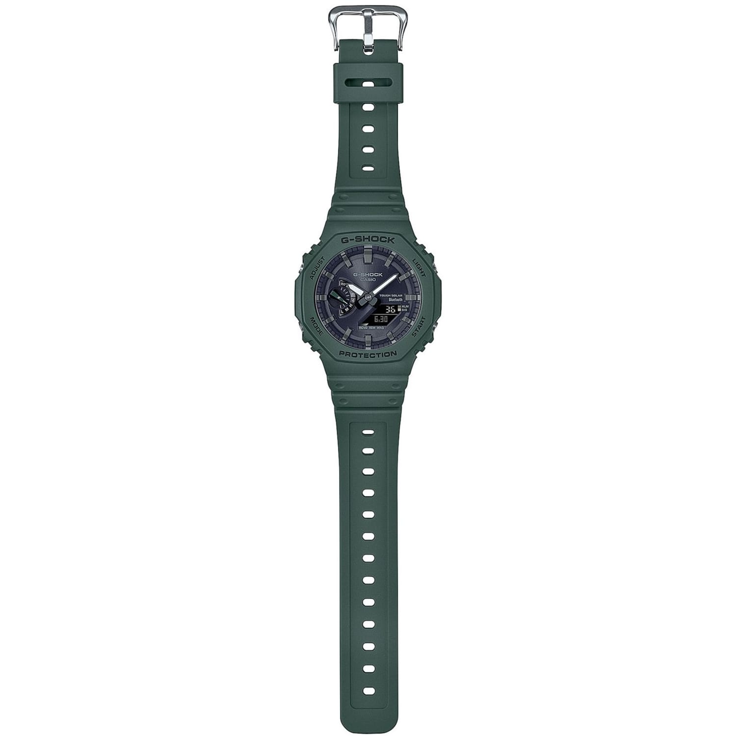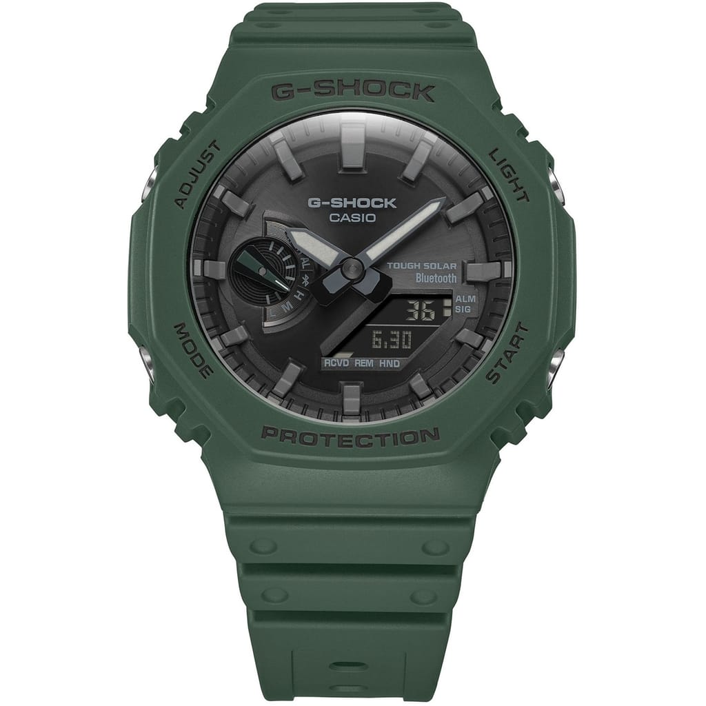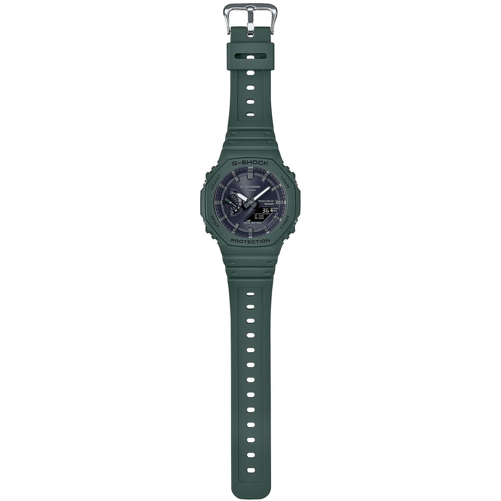With Bluetooth® connectivity and a solar charging system, the new GA-B2100 shock-resistant watches take the iconic 2100 series to a whole other level. The Tough Solar charging system effectively converts light from any light source to power the watch, eliminating the need to replace the battery, and Smartphone pairing via Bluetooth® delivers accurate timekeeping. Combining the Carbon Core Guard structure, which protects the module and provides both shock resistance and a compact case, with G-SHOCK classic colours first used in the G-SHOCK 5600 models enables you to wear the latest, and the greatest G-SHOCK has to offer. GA-B2100-3AER is a subtle green colour with a reverse LCD.