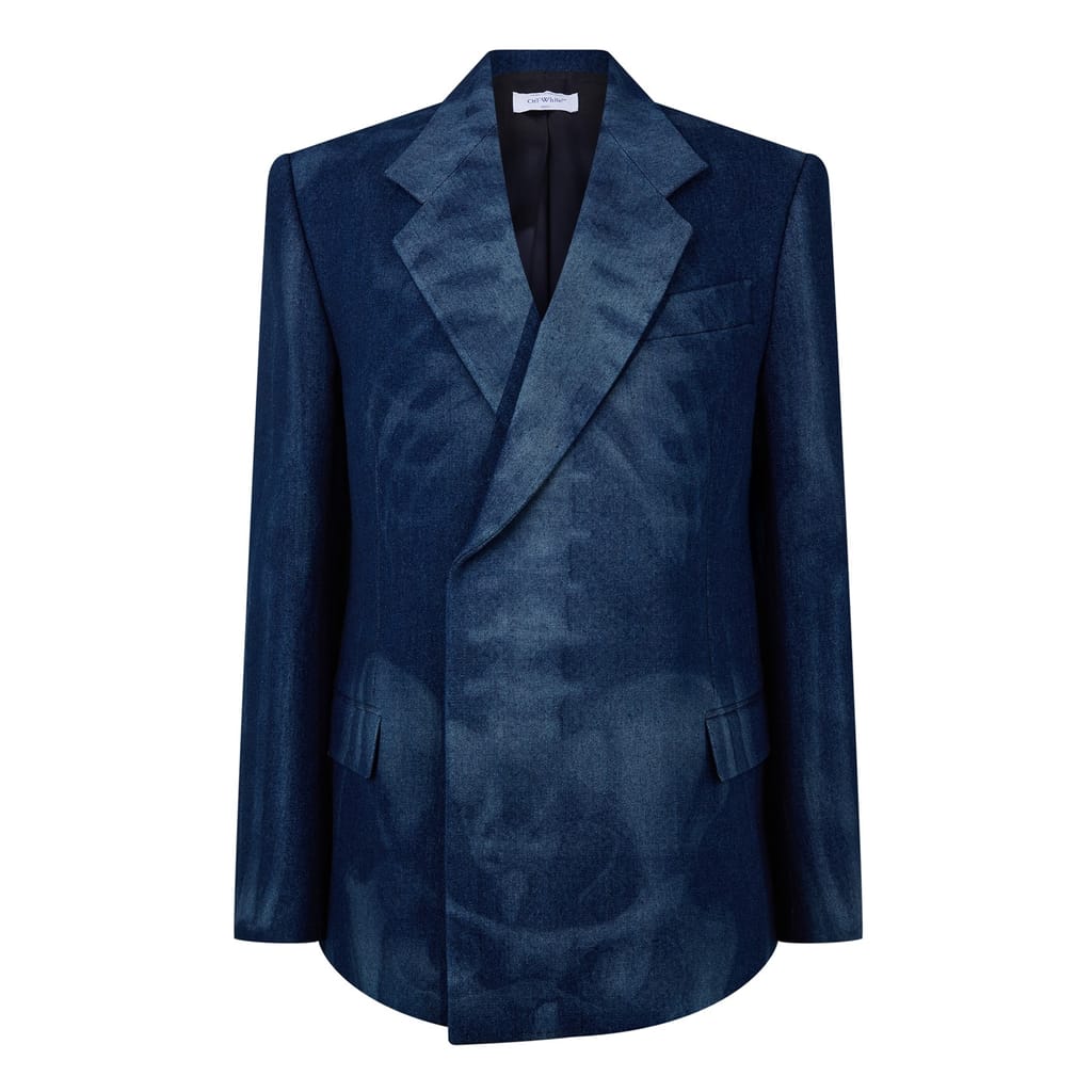 This Off-White denim jacket features a relaxed fit with a lapel collar and a straight hem. It is adorned with a graphic print and includes practical pockets. The jacket is secured with a button closure, offering both style and functionality. -