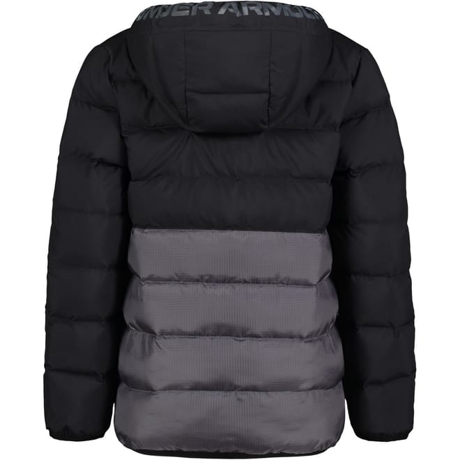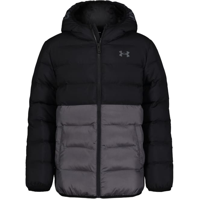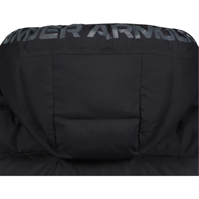 Stay warm and stylish with the Under Armour puffer coat. This lightweight jacket from the outerwear collection features a hooded neckline and a zipper closure for a relaxed fit. Embellished with the brand's logo, this solid pattern puffer is perfect for keeping you comfortable in chilly weather. -