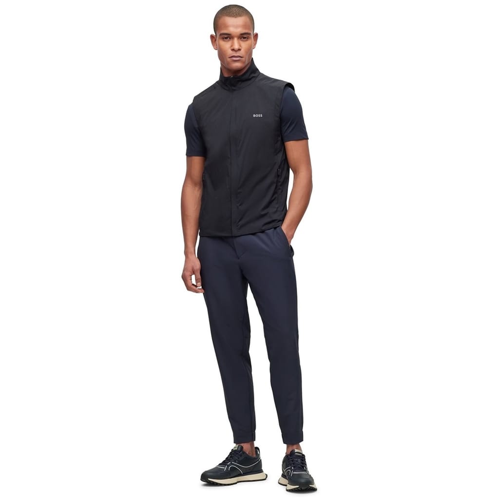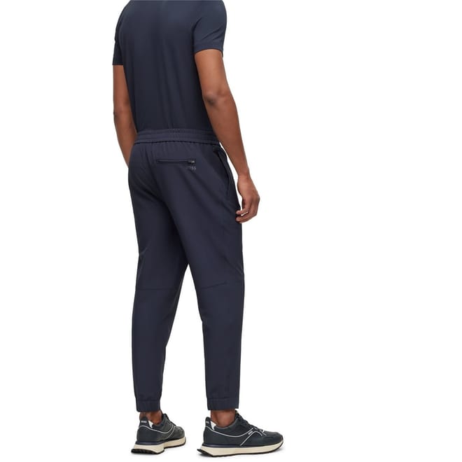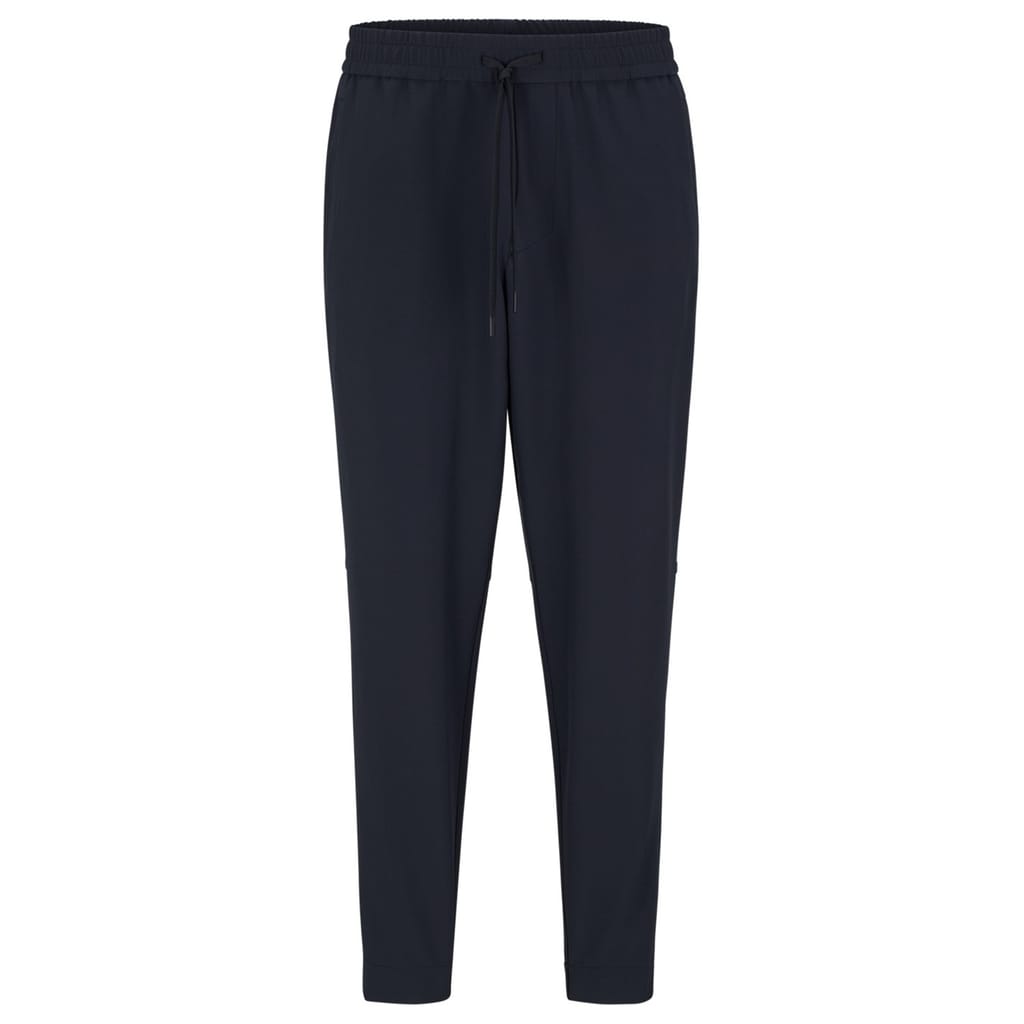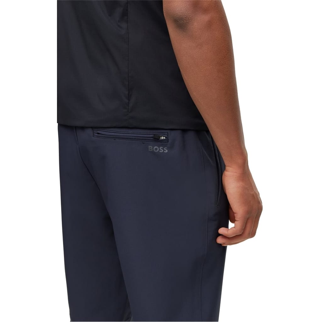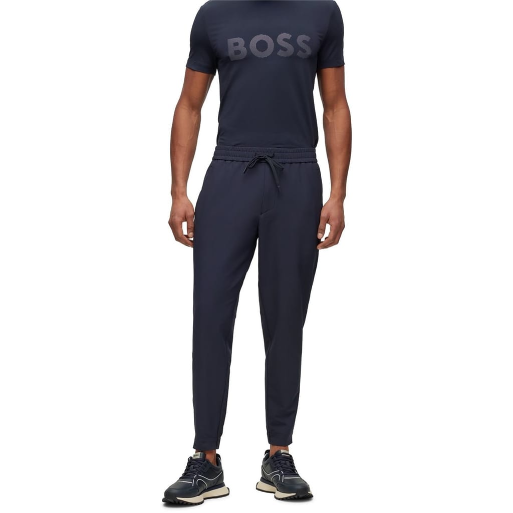 Modern athleisure takes form in these slim-fit flex trousers from BOSS. Designed with a tapered leg and elasticated cuffs, these versatile bottoms offer unrestricted movement for daily wear. The drawstring waistband provides a customisable fit, while the clean lines maintain a smart aesthetic that transitions seamlessly from casual settings to relaxed work environments.