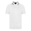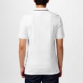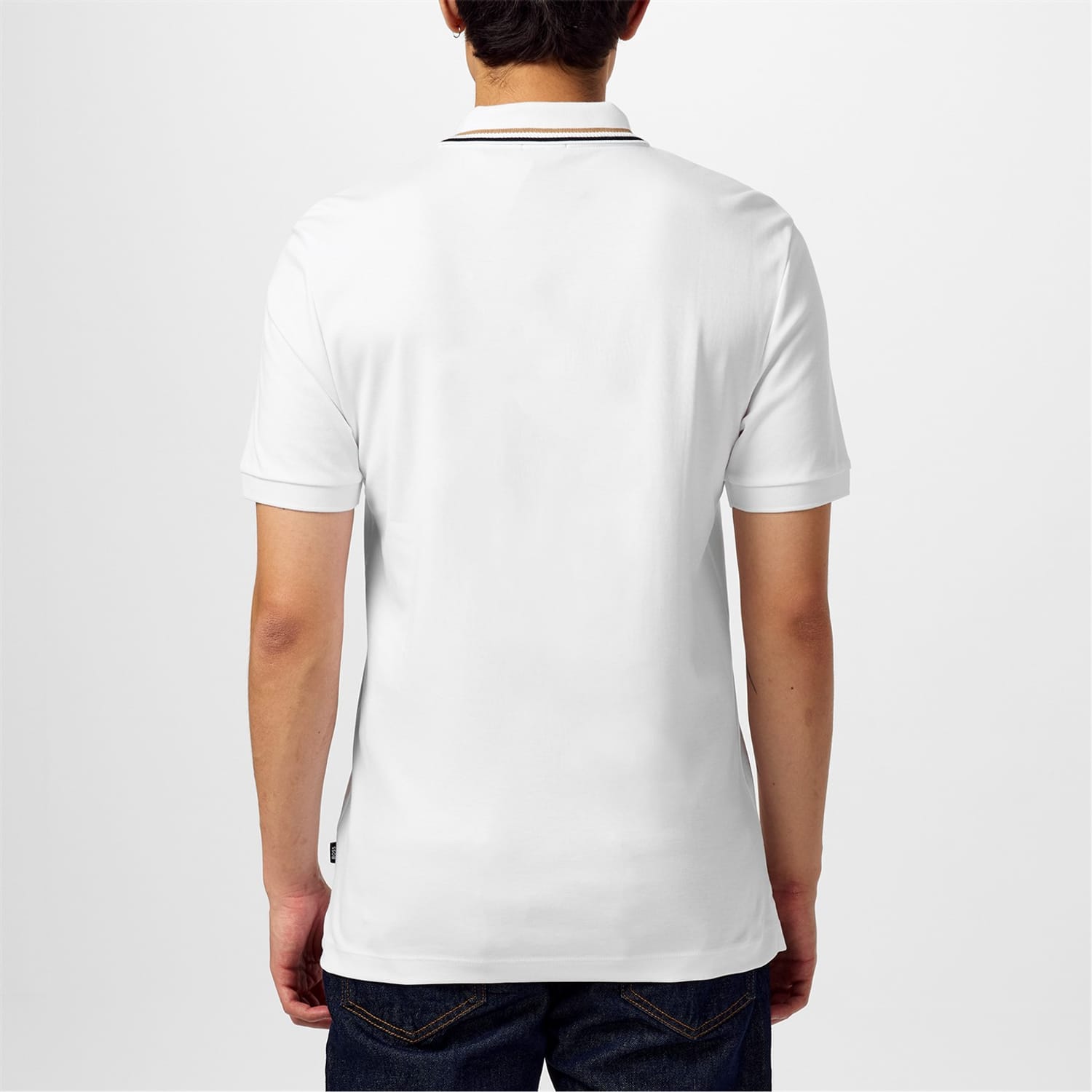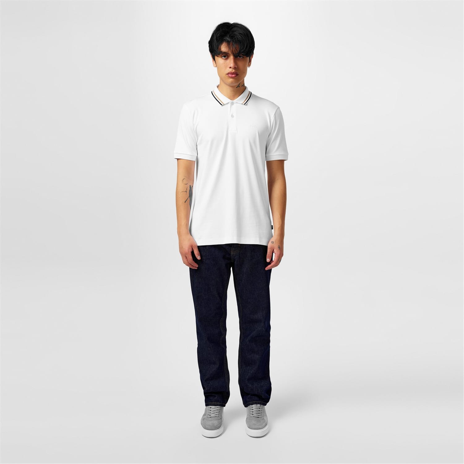 - For a polished and upscale look, the striped trim to the polo collar complements the overall aesthetic.