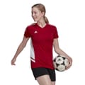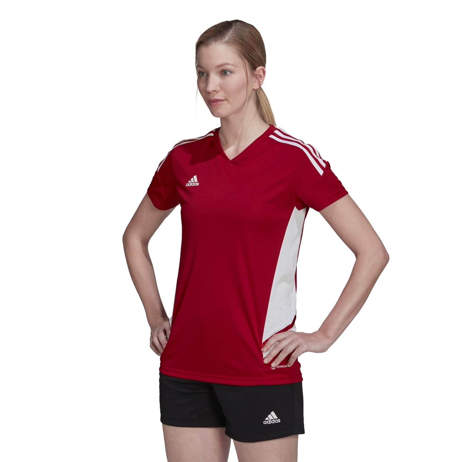 Created for top-level football, this adidas Condivo 22 jersey is all about comfortable movement. Expertly made from 100% recycled polyester creating a luxuriously lightweight appeal that is both comfortable and breathable. Its ventilating mesh side panels are shaped and positioned with female athletes in mind. Framed with short sleeves and offering a straight hem and v-neck collar this T-Shirt boasts a timeless edge. Working hard to wick moisture from your skin, AEROREADY ensures a fresh feeling fit that keeps you focused on putting your best foot forward. Designed in a classic colourway this shirt features branded trims and the iconic adidas branding printed on the left front for a prestigious finish. -