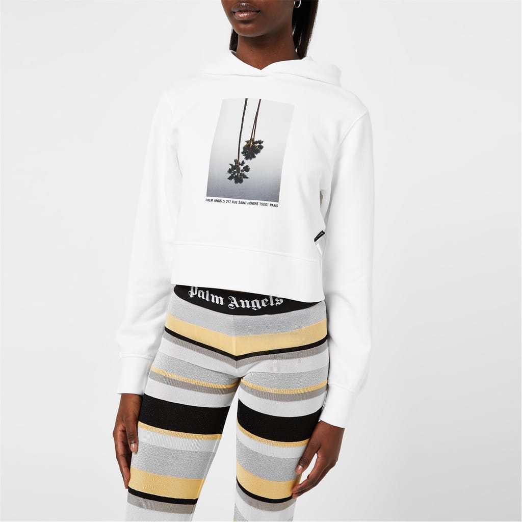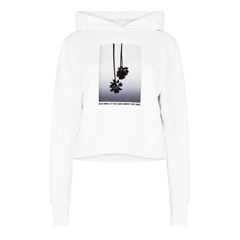 - Easily distinguishable with the house's signature palm tree motif, this jumper embraces Palm Angels LA aesthetic, while its pure cotton construction showcases its fine Italian craftsmanship. Designed with a unique short waist and boxy shape, a modern relaxed fit is created, making this hoodie perfect for comfortable everyday wear. Adorned with the upside-down print at the centre, a distinctive edgy style is provided, while the placement of the store address in Paris adds an element of luxury exclusivity. With its long sleeves, ribbed cuffs and ribbed hem, the Mirage Fitted Hoodie ensures a secure fit for optimal warmth.