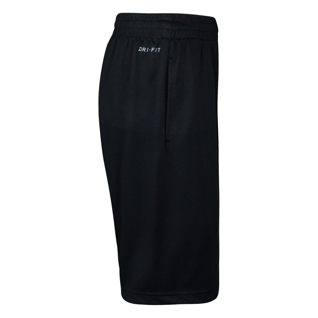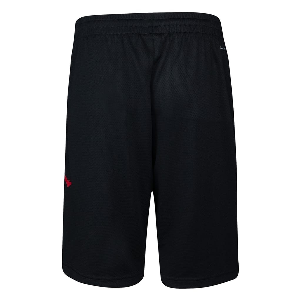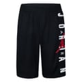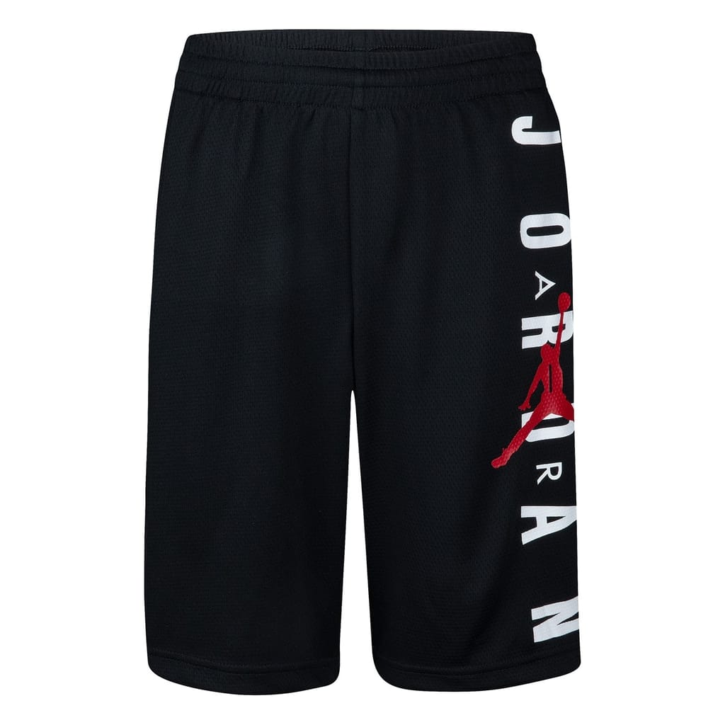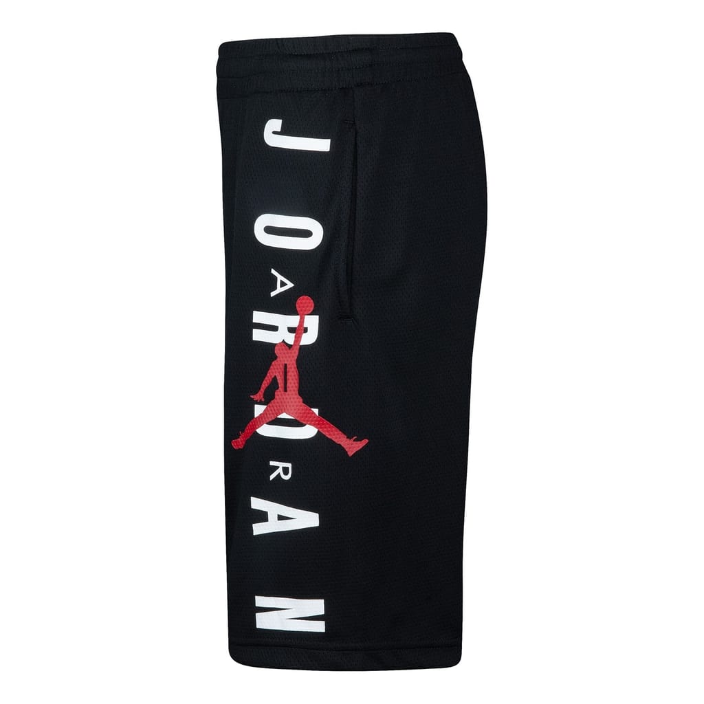These Air Jordan basketball shorts for juniors and children feature a graphic print and mesh details, offering a stylish and breathable option for active days. The woven design includes a drawstring closure for a secure fit. Embellished with a logo and pockets, these athletic shorts are perfect for young sports enthusiasts. -