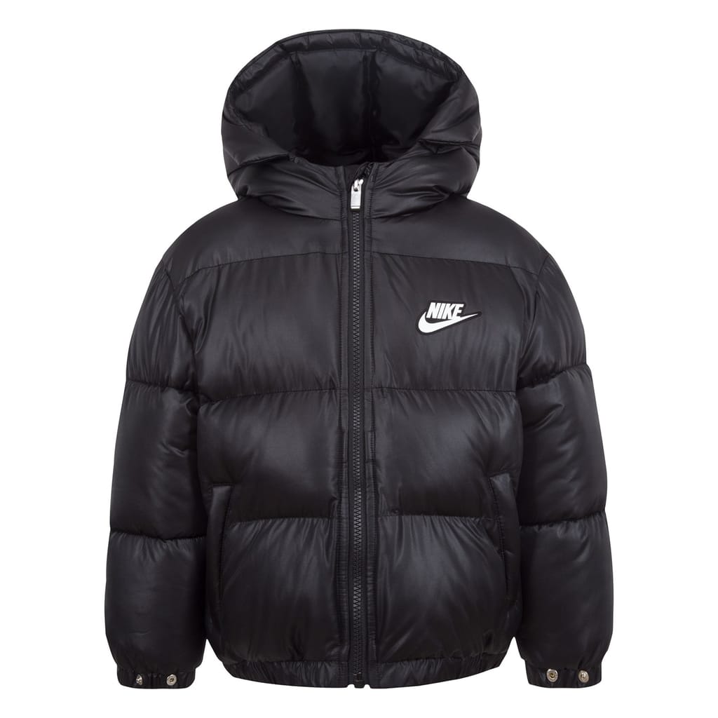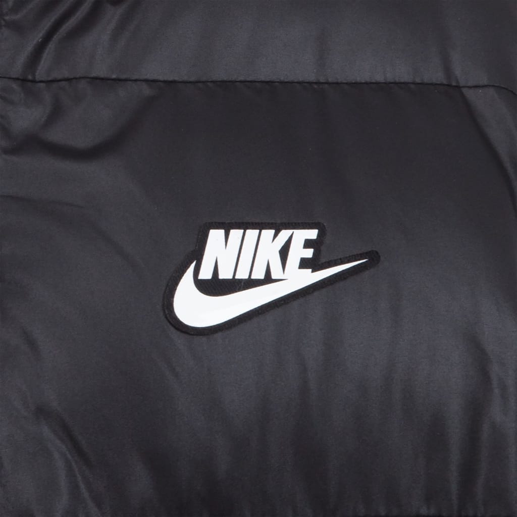 This Nike puffer jacket is designed for optimal protection in colder climates. The jacket features a water-repellent finish and heavy-weight construction, ideal for keeping warm. A hooded neckline adds extra coverage, while the elasticated cuffs ensure a snug fit. The solid pattern and logo embellishment offer a clean, sporty look. The jacket is secured with a convenient zipper closure, and the regular fit ensures comfort. -