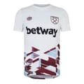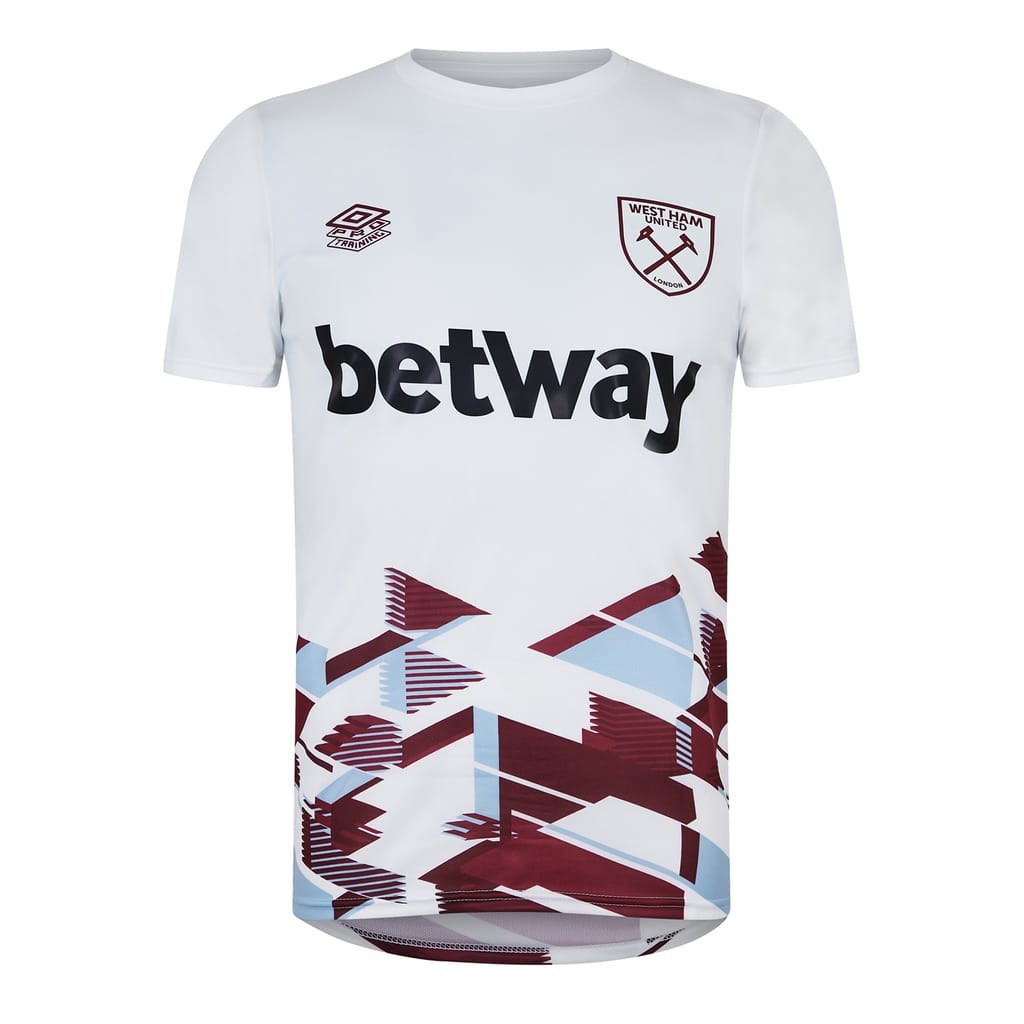 Get ready to show off your unwavering support for West Ham United with the Umbro Warm Up Jersey 2023-2024 Adults! This jersey is not just a piece of sportswear; it's a symbol of your passion, determination, and love for the game. With its dynamic and eye-catching graphic design on the body, sleeves, and collar, you're sure to turn heads both on and off the field. The dropped shaped hem adds a touch of style while providing a comfortable fit that moves with you. And let's not forget the iconic Stacked Diamond logo, a mark of quality and authenticity. Influenced by the demands of the game, this jersey features short sleeves and a crew neckline, ensuring optimal freedom of movement and breathability throughout the most intense matches. The seamless stitch construction adds durability and comfort, allowing you to focus on your performance without any distractions. Made from breathable material, this jersey keeps you cool and comfortable, even during the most heated moments of the game. So -